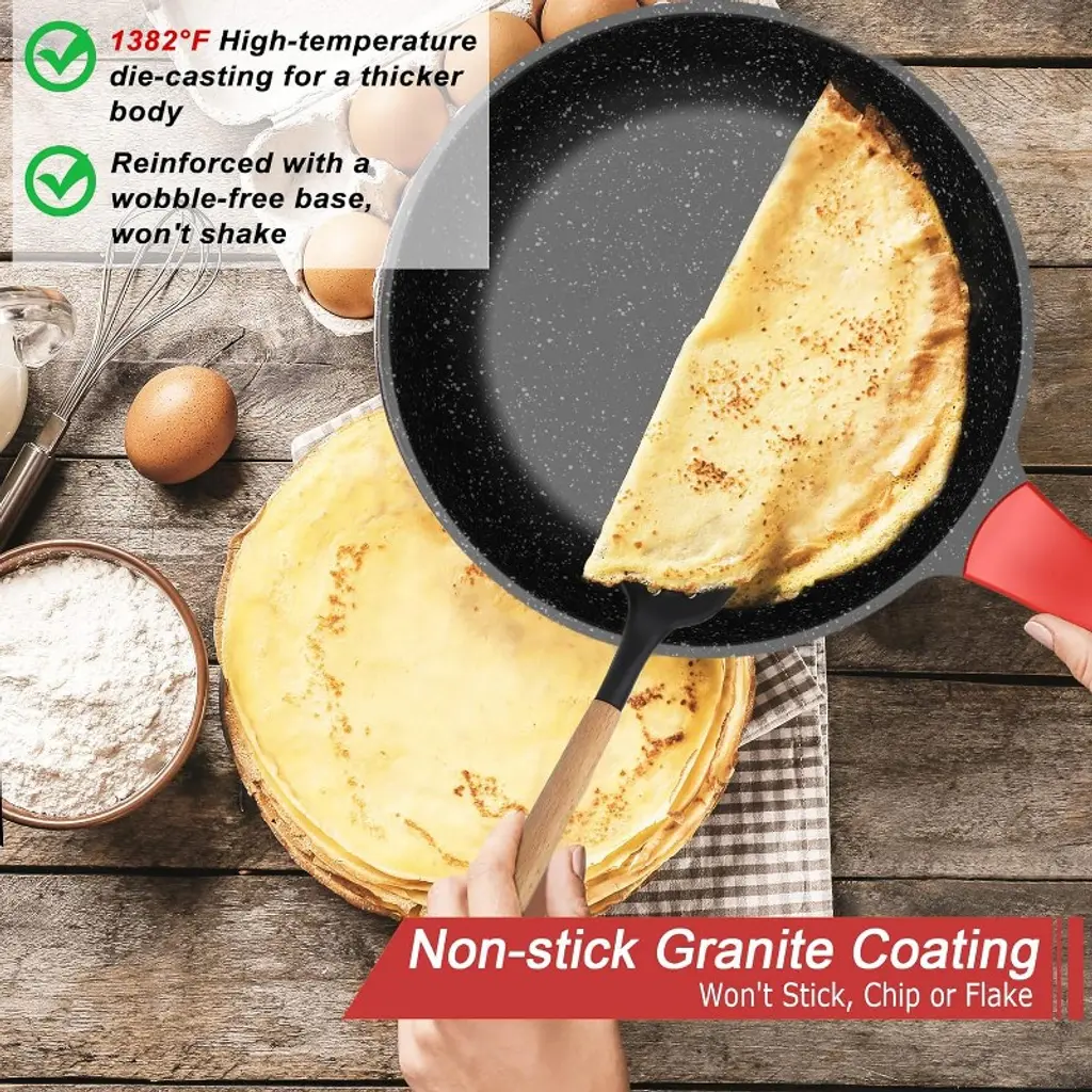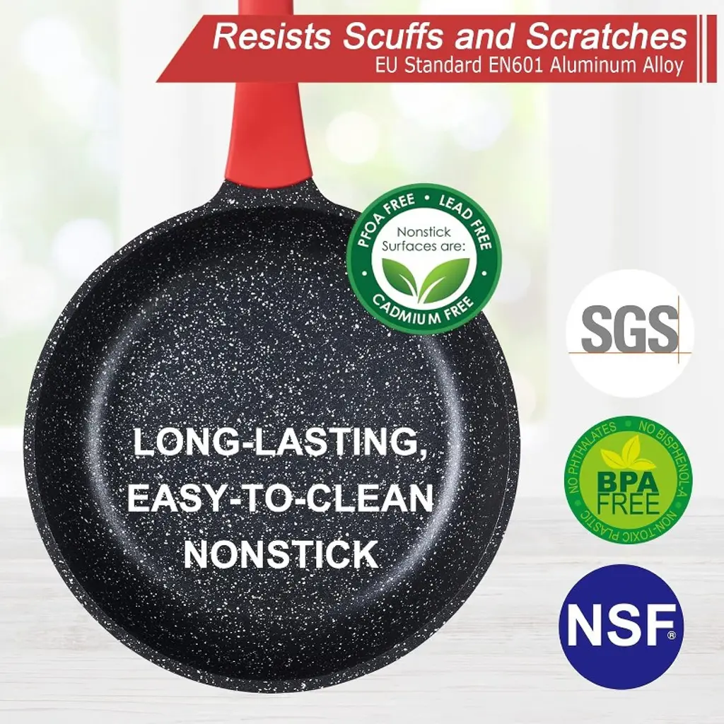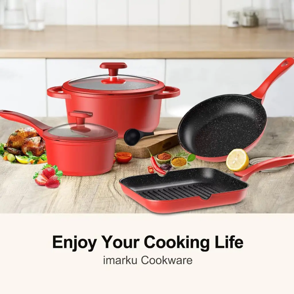 ¡¾Nonstick Coating Without Warping & Flaking¡¿ Scratch-proof non-stick granite coating keeps food sliding smoothly along the surface, preventing food to stick, and making cooking easier. Sturdy interiors can avoid chipping and coming off. imarku pots and pans set are made of high-temperature die-casting, making the cooking pots with a thicker body, and reinforced with a wobble-free base for extra strength and heating. ¡¾Health Cooking¡¿ imarku kitchen cookware sets adopt EU standard aluminum alloy(EN601), which can be in direct contact with food, including trace elements such as titanium, zinc, strontium, magnesium which are beneficial to the human body. Toxin-free Whitford xylan surface layer ensures this pots and pans are free of PFOA, PFOS, lead & cadmium. (Have FDA certification for SGS testing) ¡¾Ultra-Durable & Heat-Resistant Handles¡¿The handle of the pan set is covered with soft rubber to keep staying cool and allow total control with a comfortable grip. Vented tempered glass lids trap in heat and moisture. Food-grade silicone edging of the cookware for better sealing. Suitable for ceramic, electric, gas, grill, and induction cooking stoves, quick and even heating. Safe cooking temperature up to 480¡ãF. ¡¾Easy to Clean¡¿Coated nonstick coating three times to deliver food release easily, rivetless interior to prevent snags and food buildup, this pot and pan set is easy to help you solve sticky or difficult-to-clean problems. Hand-wash with the cotton sponge or dishcloth after the cookware cools down to prevent the surface from being scratched. (Do not use sharp shovels or brushes) ¡¾16-Pic Red Cooking Sets¡¿imarku pots and pans set nonstick include 2-quart milk pot, 5.5-quart stockpot with glass lid, 9.5" &11" frying pan, 11" * 3.15" H frying pan with glass lid, 11" square frying pan, 3 different silicone spatulas, soft heat insulation pads and gloves (to make your complicated kitchen work safer). A perfect gift for Mother's Day, Weddings, Valentines, Housewarming, Thanksgiving and Christmas.