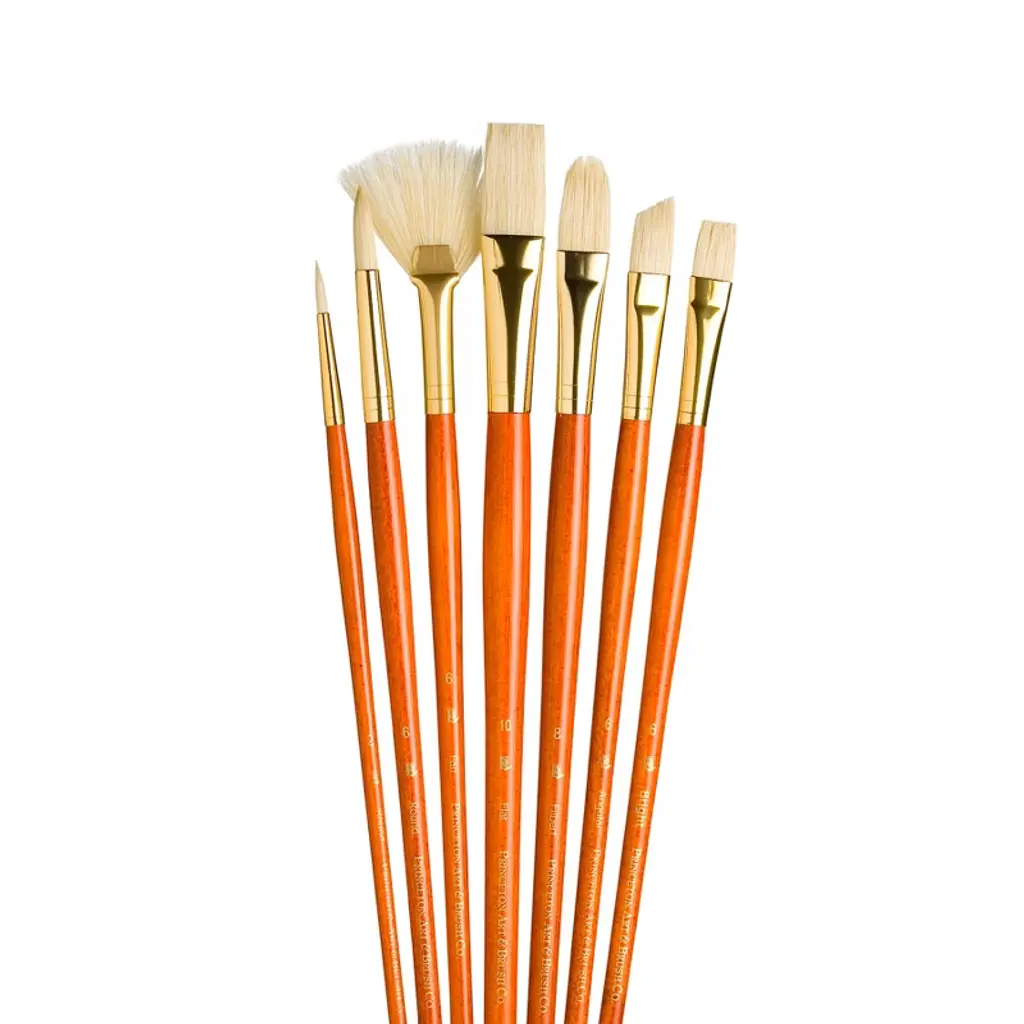 Princeton RealValue Brush Set, Natural Bristles, Long Handle Mixed Media Paintbrush, Orange, 7 Per Set, 2 Sets | Princeton Artist Co. proudly presents the RealValue paintbrush collection—a curated series of meticulously selected brush sets that cater to every artistic need. Whether you prefer short-handle or long-handle styles, natural, synthetic, or a blend of bristles, the RealValue collection offers an unparalleled range of shapes and sizes. Designed to meet the demands of artists across all mediums—acrylic, watercolor, tempera, and oil—these brushes deliver exceptional mixed media performance at an incredible value. With RealValue, you'll find the perfect brush set to elevate your craft, whether you're just beginning or are a seasoned professional. Each set includes 7 brushes. Sold as 2 sets for a total of 14 brushes.
