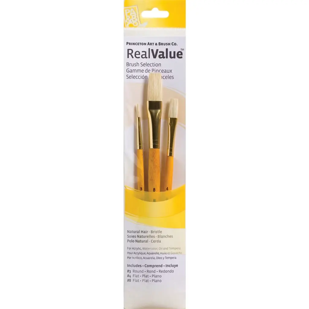 Princeton RealValue Brush Set, Natural Bristles, Short Handle Mixed Media Paintbrush, Yellow, 3 Per Set, 6 Sets | Princeton Artist Co. proudly presents the RealValue paintbrush collection—a curated series of meticulously selected brush sets that cater to every artistic need. Whether you prefer short-handle or long-handle styles, natural, synthetic, or a blend of bristles, the RealValue collection offers an unparalleled range of shapes and sizes. Designed to meet the demands of artists across all mediums—acrylic, watercolor, tempera, and oil—these brushes deliver exceptional mixed media performance at an incredible value. With RealValue, you'll find the perfect brush set to elevate your craft, whether you're just beginning or are a seasoned professional. Each set includes 3 brushes. Sold as 6 sets for a total of 18 brushes.