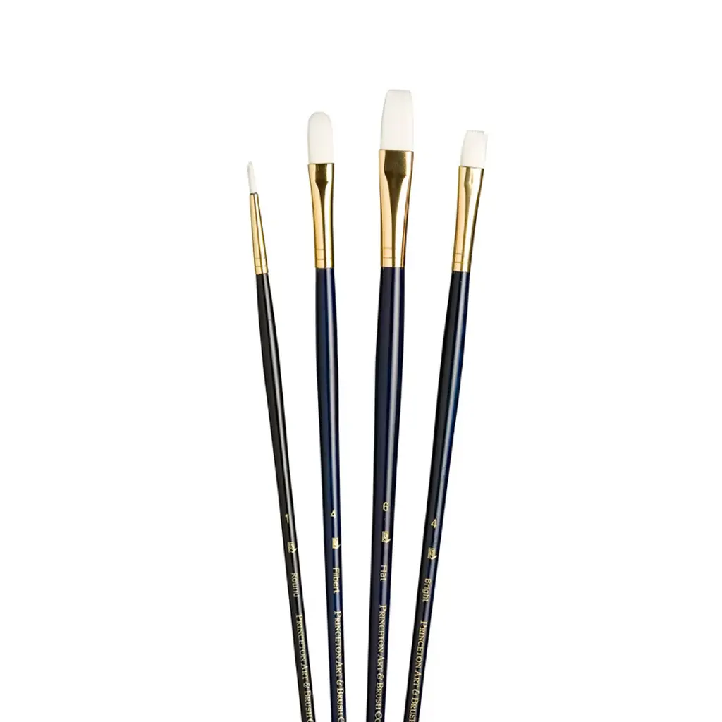 Princeton RealValue Brush Set, White Taklon Bristles, Long Handle Mixed Media Paintbrush, Dark Blue, 4 Per Set, 2 Sets | Princeton Artist Co. proudly presents the RealValue paintbrush collection—a curated series of meticulously selected brush sets that cater to every artistic need. Whether you prefer short-handle or long-handle styles, natural, synthetic, or a blend of bristles, the RealValue collection offers an unparalleled range of shapes and sizes. Designed to meet the demands of artists across all mediums—acrylic, watercolor, tempera, and oil—these brushes deliver exceptional mixed media performance at an incredible value. With RealValue, you'll find the perfect brush set to elevate your craft, whether you're just beginning or are a seasoned professional. Each set includes 4 brushes. Sold as 2 sets for a total of 8 brushes.