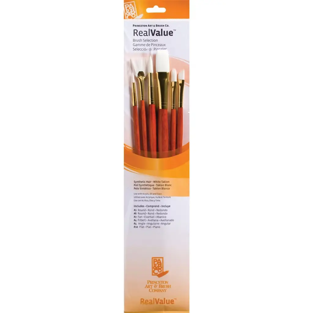 Princeton RealValue Brush Set, White Taklon Bristles, Long Handle Mixed Media Paintbrush, Orange, 6 Per Set, 2 Sets | Princeton Artist Co. proudly presents the RealValue paintbrush collection—a curated series of meticulously selected brush sets that cater to every artistic need. Whether you prefer short-handle or long-handle styles, natural, synthetic, or a blend of bristles, the RealValue collection offers an unparalleled range of shapes and sizes. Designed to meet the demands of artists across all mediums—acrylic, watercolor, tempera, and oil—these brushes deliver exceptional mixed media performance at an incredible value. With RealValue, you'll find the perfect brush set to elevate your craft, whether you're just beginning or are a seasoned professional. Each set includes 6 brushes. Sold as 2 sets for a total of 12 brushes.