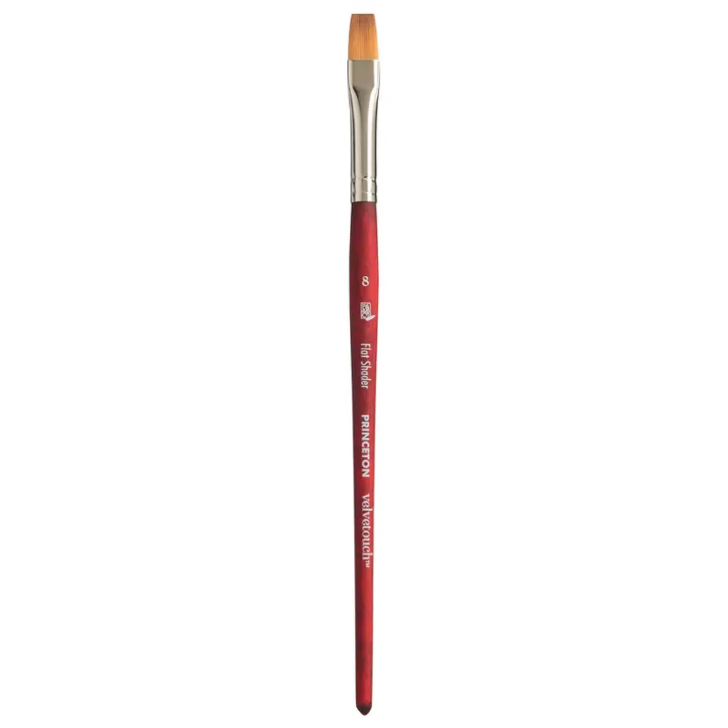 Princeton Velvetouch Flat Shader Brush, Synthetic Bristles, Short Handle Mixed Media Paintbrush, Scarlet, Size 8, Pack of 3 | Velvetouch, from Princeton Artist Brush, presents a comprehensive collection of multi-media brushes crafted by expert brush makers, meticulously engineered to deliver superior performance across oil, acrylic, watercolor, and gouache mediums. These brushes are perfect for capturing the finest details, blocking, shading, lettering, or applying washes. Crafted with a unique blend of luxury synthetic filaments, offering exceptional versatility, enhanced color-holding capacity, and precise color placement. The signature Velvetouch handle provides a smooth, comfortable grip, ensuring better control with every stroke. With a wide array of essential, specialty, and miniature brushes, Velvetouch offers an affordable, durable, and animal-friendly solution for artists at any level. Whether you're a seasoned professional or just beginning your artistic journey, these premium brushes are designed to help you create your next masterpiece with confidence. Sold as a pack of 3.