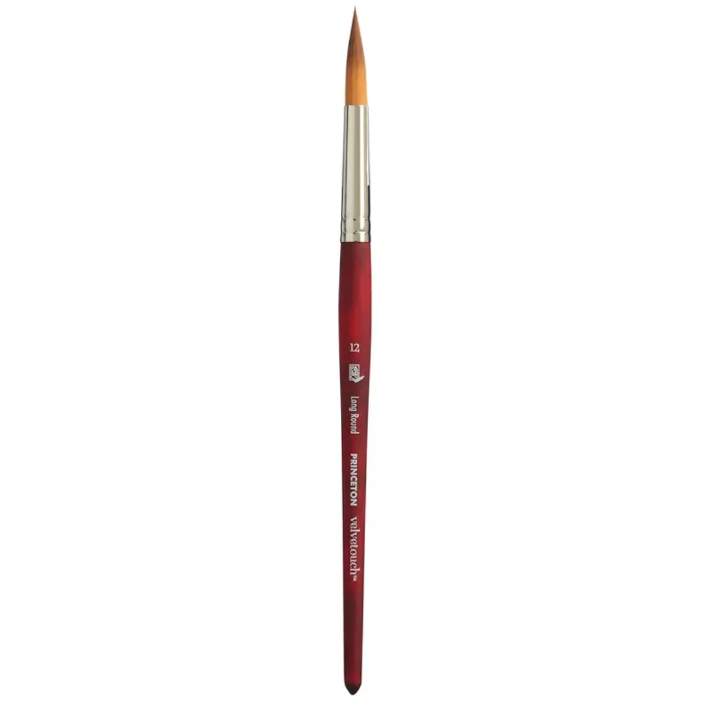Princeton Velvetouch Long Round Brush, Synthetic Bristles, Short Handle Mixed Media Paintbrush, Scarlet, Size 12, Pack of 2 | Velvetouch, from Princeton Artist Brush, presents a comprehensive collection of multi-media brushes crafted by expert brush makers, meticulously engineered to deliver superior performance across oil, acrylic, watercolor, and gouache mediums. These brushes are perfect for capturing the finest details, blocking, shading, lettering, or applying washes. Crafted with a unique blend of luxury synthetic filaments, offering exceptional versatility, enhanced color-holding capacity, and precise color placement. The signature Velvetouch handle provides a smooth, comfortable grip, ensuring better control with every stroke. With a wide array of essential, specialty, and miniature brushes, Velvetouch offers an affordable, durable, and animal-friendly solution for artists at any level. Whether you're a seasoned professional or just beginning your artistic journey, these premium brushes are designed to help you create your next masterpiece with confidence. Sold as a pack of 2.