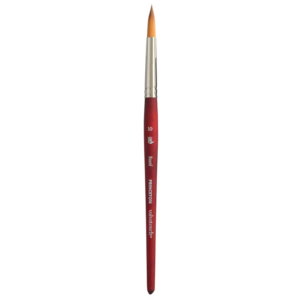 Princeton Velvetouch Round Brush, Synthetic Bristles, Short Handle Mixed Media Paintbrush, Scarlet, Size 10, Pack of 2 | Velvetouch, from Princeton Artist Brush, presents a comprehensive collection of multi-media brushes crafted by expert brush makers, meticulously engineered to deliver superior performance across oil, acrylic, watercolor, and gouache mediums. These brushes are perfect for capturing the finest details, blocking, shading, lettering, or applying washes. Crafted with a unique blend of luxury synthetic filaments, offering exceptional versatility, enhanced color-holding capacity, and precise color placement. The signature Velvetouch handle provides a smooth, comfortable grip, ensuring better control with every stroke. With a wide array of essential, specialty, and miniature brushes, Velvetouch offers an affordable, durable, and animal-friendly solution for artists at any level. Whether you're a seasoned professional or just beginning your artistic journey, these premium brushes are designed to help you create your next masterpiece with confidence. Sold as a pack of 2.