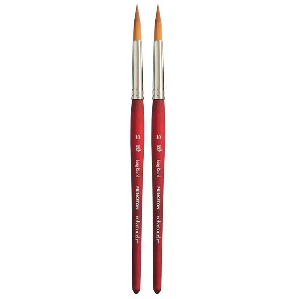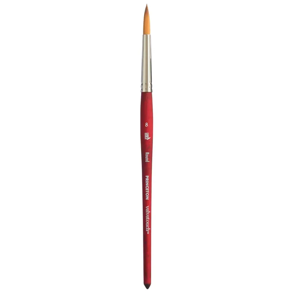 Princeton Velvetouch Round Brush, Synthetic Bristles, Short Handle Mixed Media Paintbrush, Scarlet, Size 8, Pack of 2 | Velvetouch, from Princeton Artist Brush, presents a comprehensive collection of multi-media brushes crafted by expert brush makers, meticulously engineered to deliver superior performance across oil, acrylic, watercolor, and gouache mediums. These brushes are perfect for capturing the finest details, blocking, shading, lettering, or applying washes. Crafted with a unique blend of luxury synthetic filaments, offering exceptional versatility, enhanced color-holding capacity, and precise color placement. The signature Velvetouch handle provides a smooth, comfortable grip, ensuring better control with every stroke. With a wide array of essential, specialty, and miniature brushes, Velvetouch offers an affordable, durable, and animal-friendly solution for artists at any level. Whether you're a seasoned professional or just beginning your artistic journey, these premium brushes are designed to help you create your next masterpiece with confidence. Sold as a pack of 2.