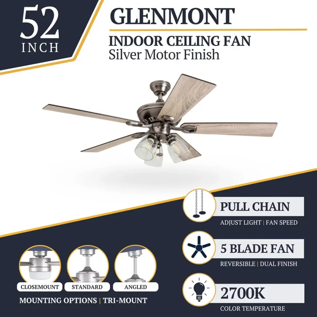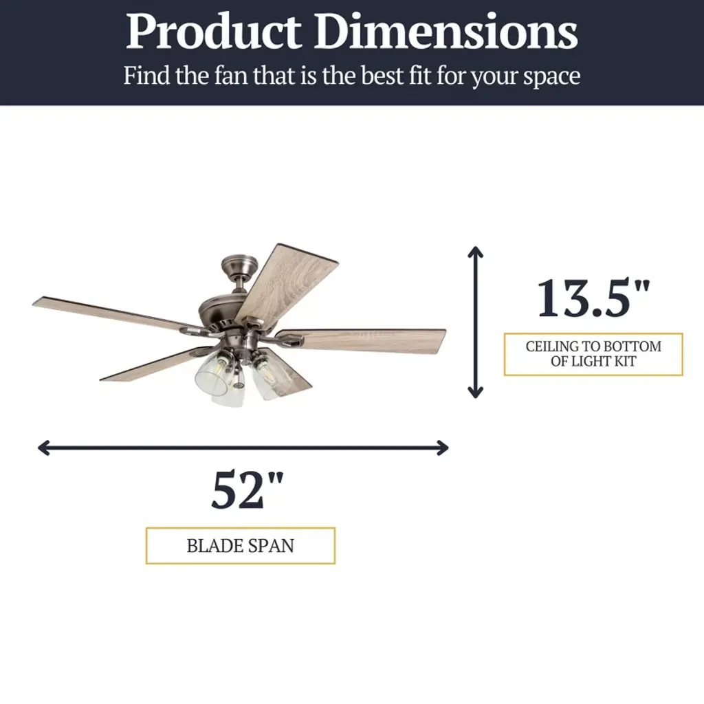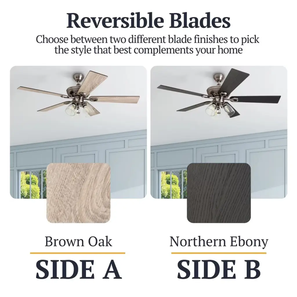 Bring comfort, charm, and character to your space with the Prominence Home 52-Inch Farmhouse LED Ceiling Fan in Antique Pewter. Designed to complement rustic and modern farmhouse aesthetics, this ceiling fan features dual-finish blades in Brown Oak and Northern Ebony, paired with an oil-rubbed bronze finish for a warm, inviting look. A perfect addition to medium-sized rooms up to 400 square feet, such as bedrooms, living rooms, dining areas, and family spaces. This ceiling fan features a quiet, 3-speed reversible motor, ideal for year-round comfort. Enjoy a cooling breeze during summer or reverse the direction in winter to help circulate warm air and reduce energy costs. Pull chain operation makes adjusting speeds and lighting simple, and the fan is also compatible with universal remotes (sold separately) for added convenience. The included 3-arm light fixture with clear seeded glass shades and vintage Edison-style B10 bulbs (3 included) provides a warm 2700K glow at 450 lumens per bulb, and is dimmable from 20% to 100% to suit your lighting needs. With 3-Mount installation options, choose between standard downrod mounting (4” downrod included), closemount for low ceilings, or angled mounting for vaulted ceilings (longer downrod sold separately). Whether you’re updating your farmhouse, rustic, or transitional-style home, the Prominence Home ceiling fan brings the ideal combination of style, function, and comfort to your indoor space.