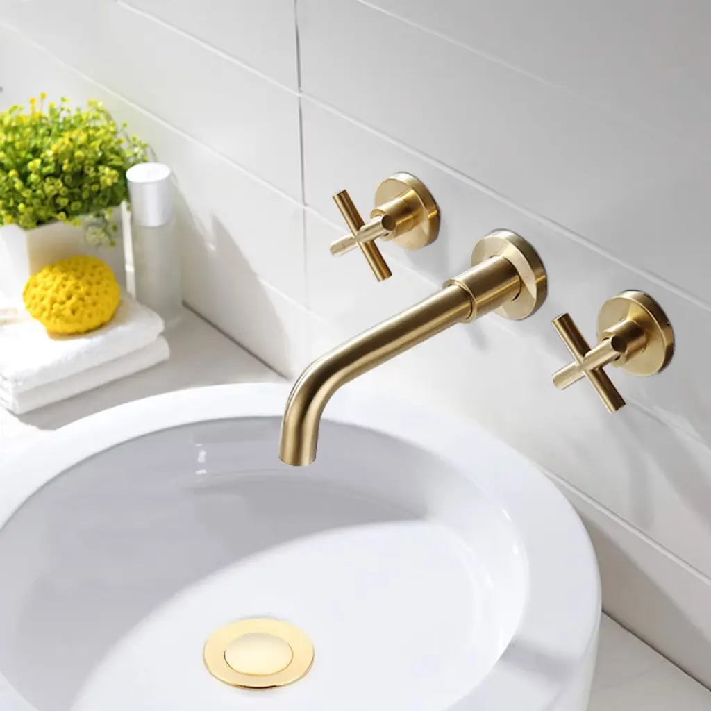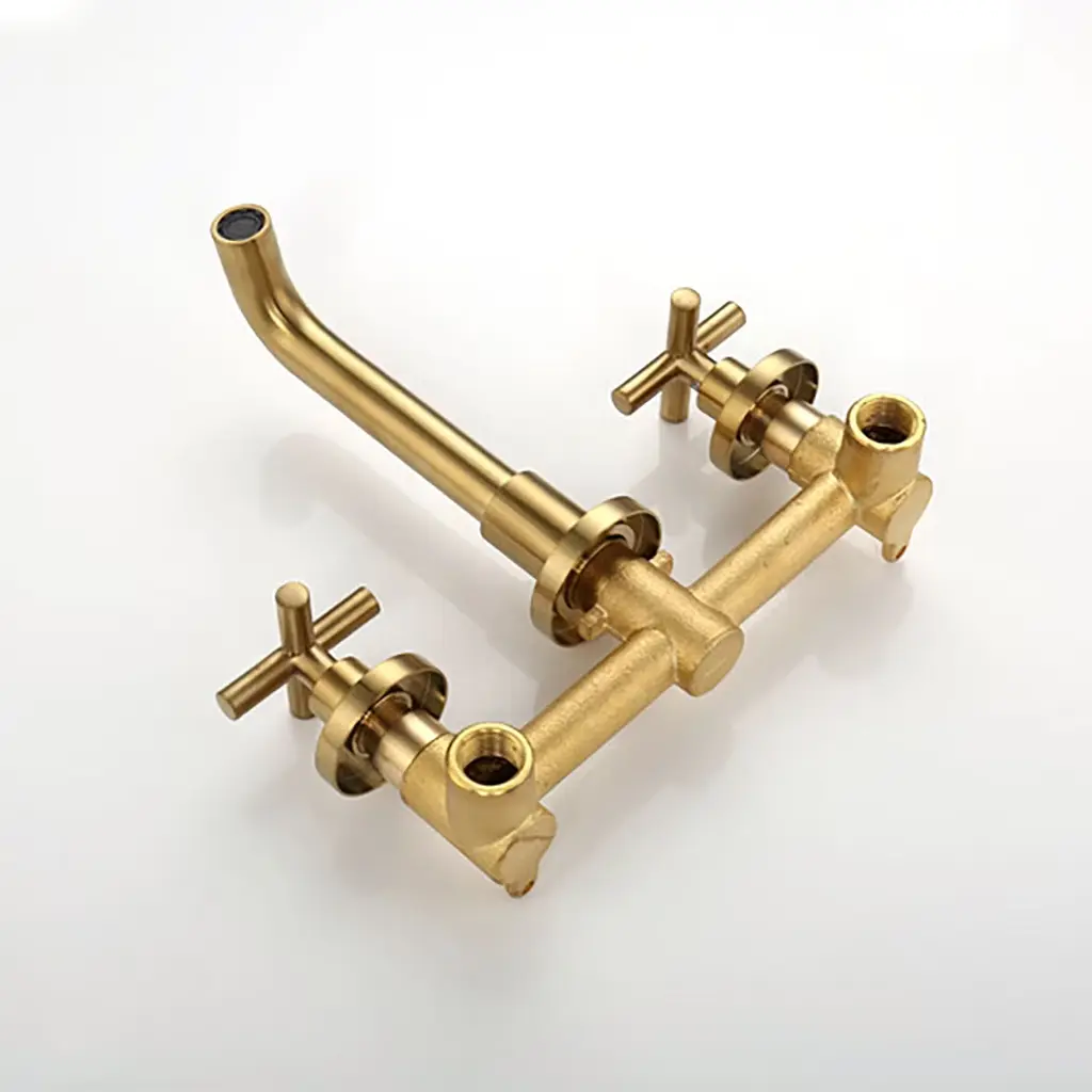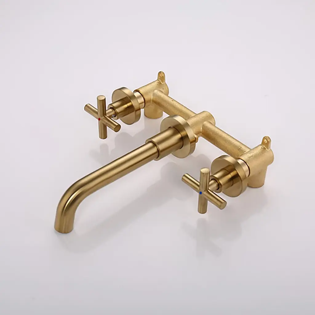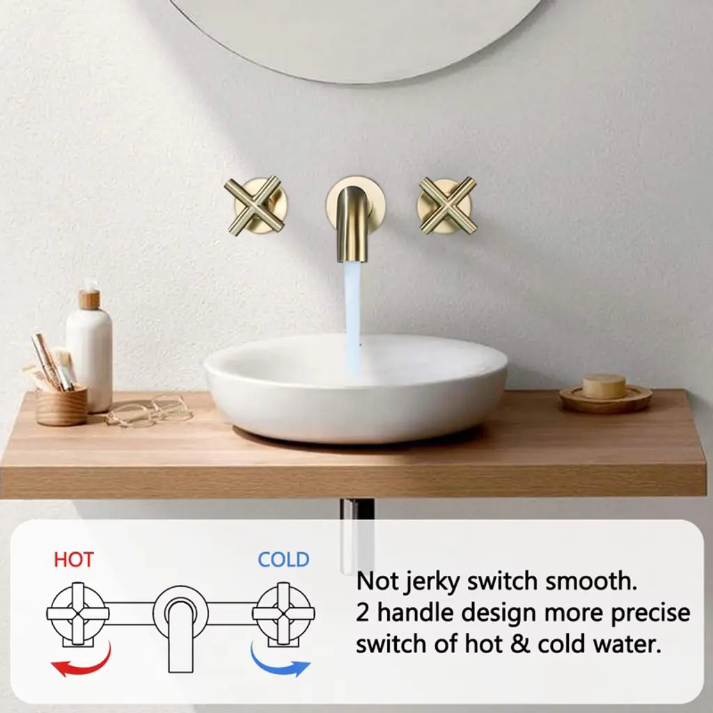 Capturing the style of minimalism design, delivered streamlined water control. Give your bathroom a vintage look with this concealed faucet, which features 2 classic cross handles and 360 degree angled spouts. The spout slopes downward to your sink and the 2 cross handles help with temperature and water flow control. The Brushed Gold finish enhances the look and fits into your bathroom decor with ease, while the wall-mount installation frees up your countertop or sink. Constructed of brass, wall-mount bathroom faucet is durable and stylish upgrade for your bathroom.