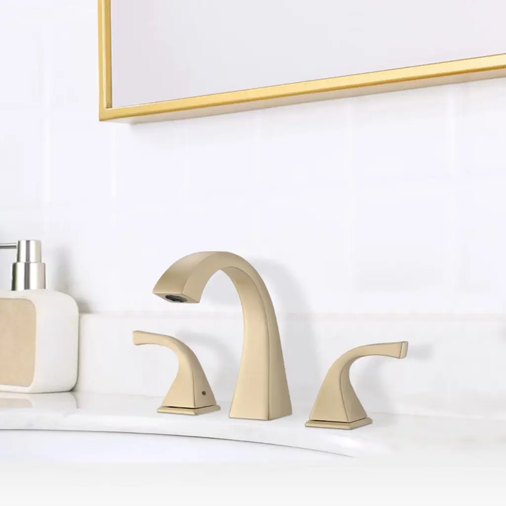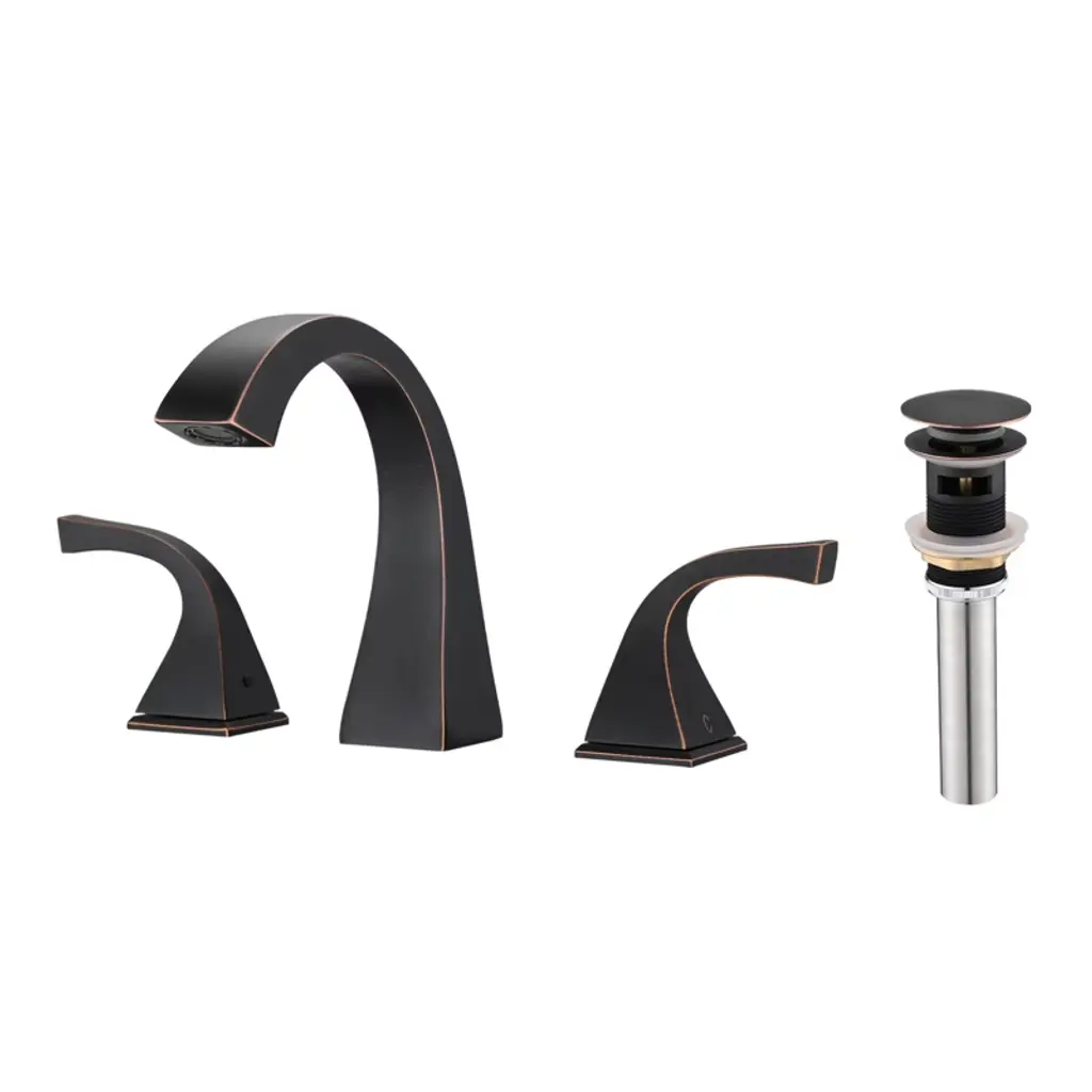 Constructed of solid brass, the Widespread Bathroom Faucet feels as premium as it looks. Separate lever handles stand alongside the gooseneck spout, which gracefully arcs above your sink. The versatile design enables it to blend well with bathroom decor ranging from transitional to modern.