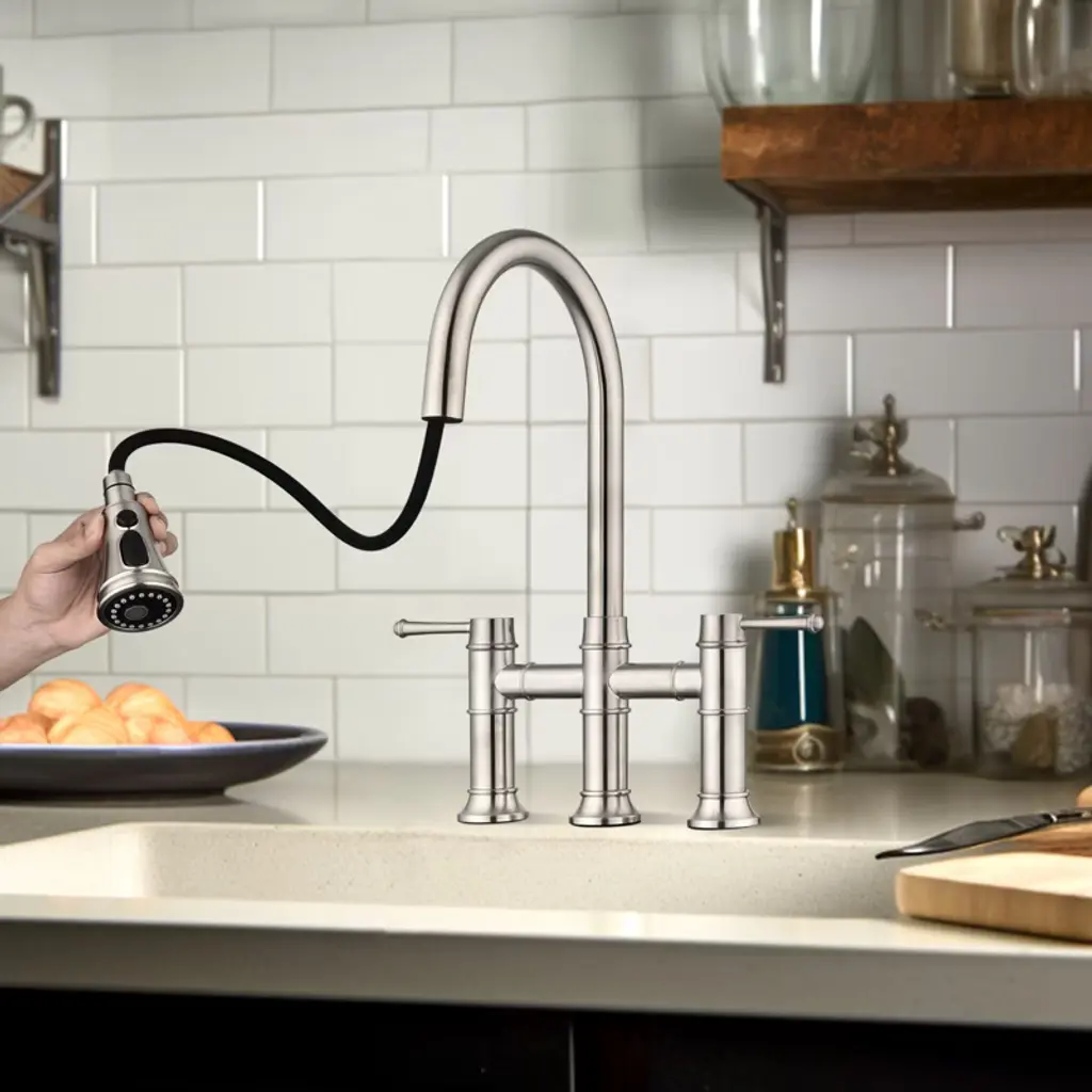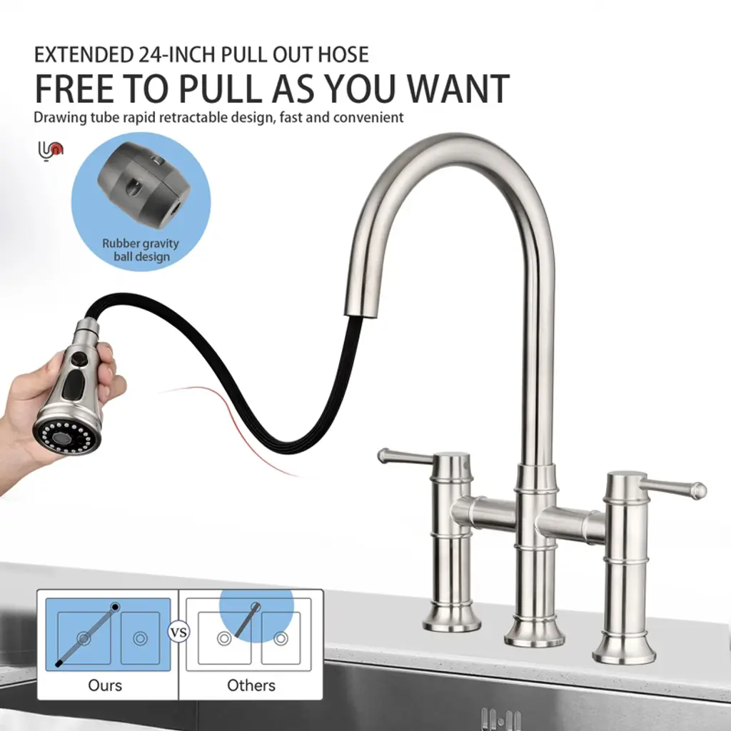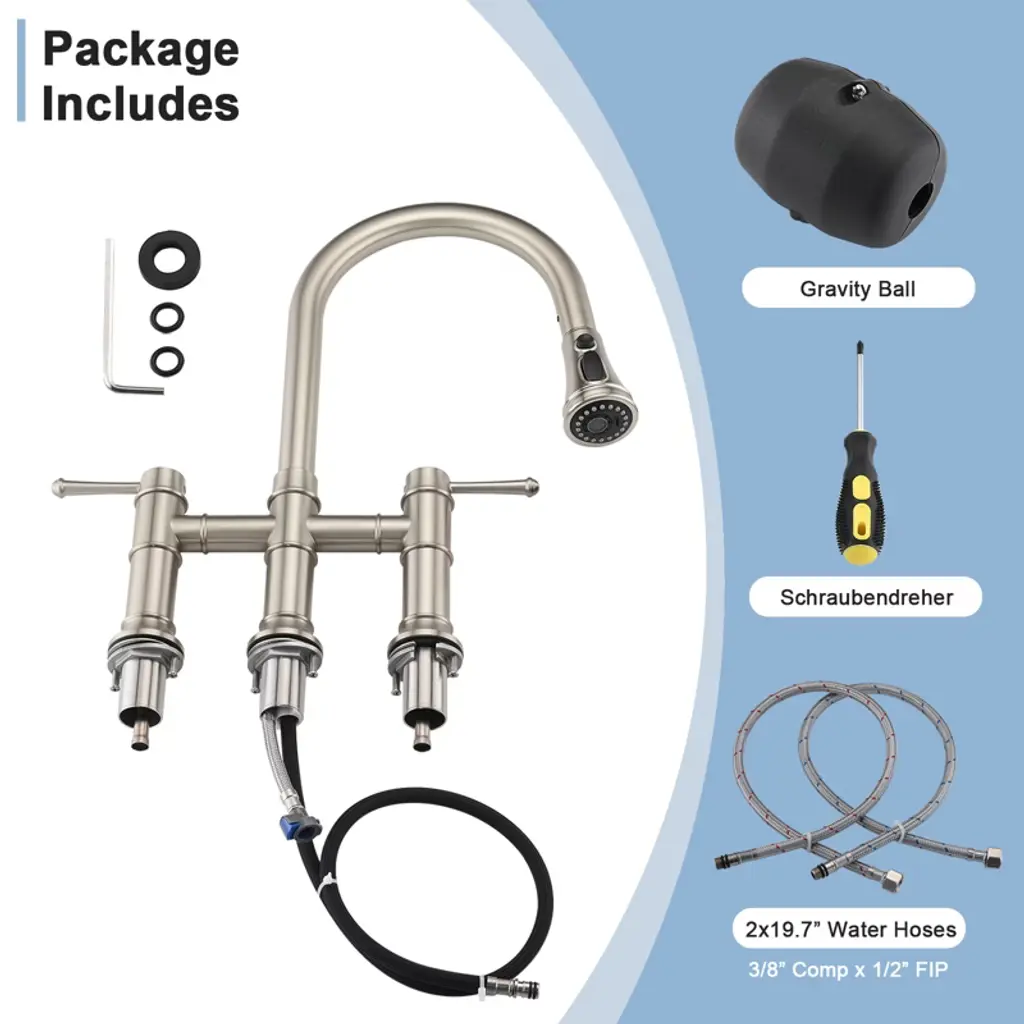 The PROOX Pull Down Bridge Kitchen Faucet,adds a touch of modern elegance to any kitchen decor while also being beautifully classic. With its two-handle design, you can easily adjust the temperature and flow to your liking or control only the cold water when needed. The faucet also features a three-function Pull Down Sprayer Head that provides additional functionality for washing dishes and food or rinsing down the sink. Additionally, its spray head allows you easily navigate between a smooth stream or a powerful and sweeping spray. The faucet is constructed of stainless steel including ceramic disc valves, ensuring smooth handle operation and durable performance.