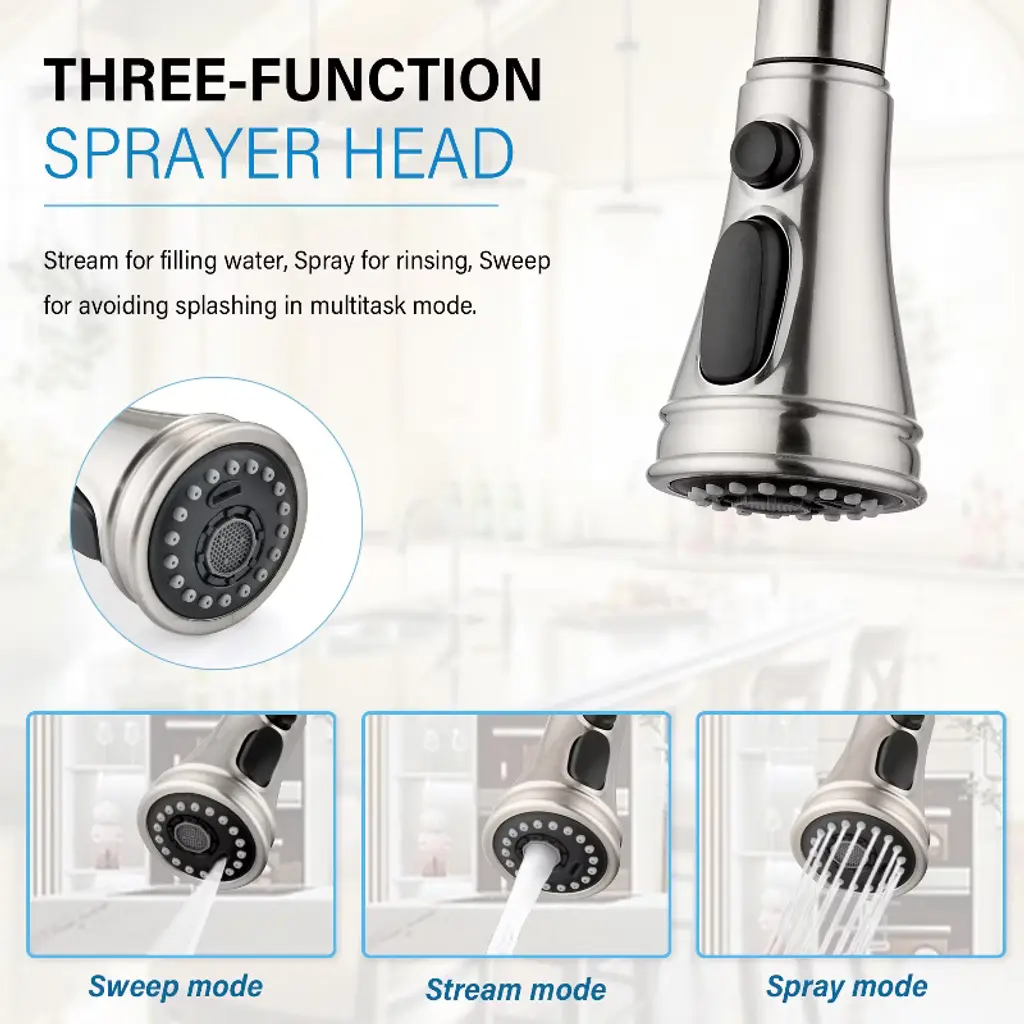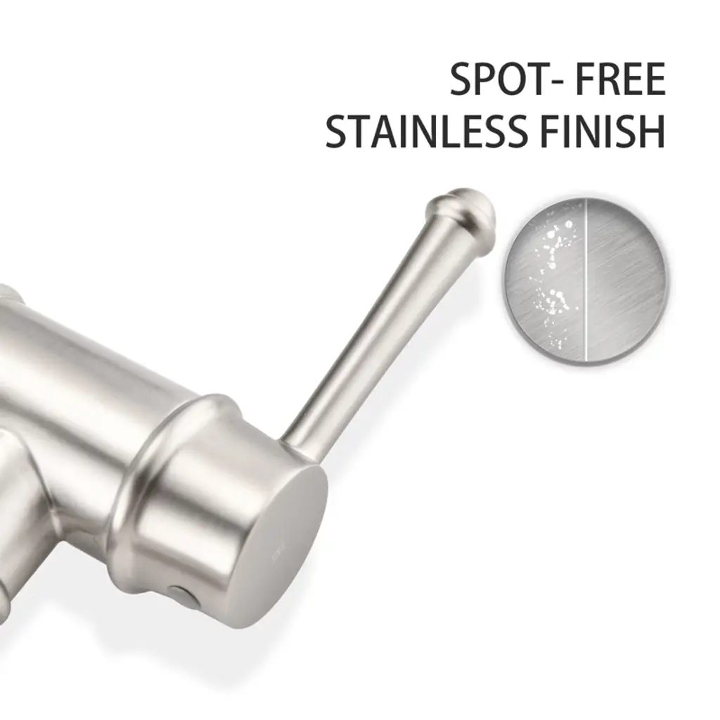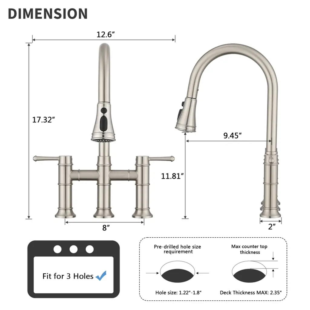 The PROOX Pull Down Bridge Kitchen Faucet,adds a touch of modern elegance to any kitchen decor while also being beautifully classic. With its two-handle design, you can easily adjust the temperature and flow to your liking or control only the cold water when needed. The faucet also features a three-function Pull Down Sprayer Head that provides additional functionality for washing dishes and food or rinsing down the sink. Additionally, its spray head allows you easily navigate between a smooth stream or a powerful and sweeping spray. The faucet is constructed of stainless steel including ceramic disc valves, ensuring smooth handle operation and durable performance.