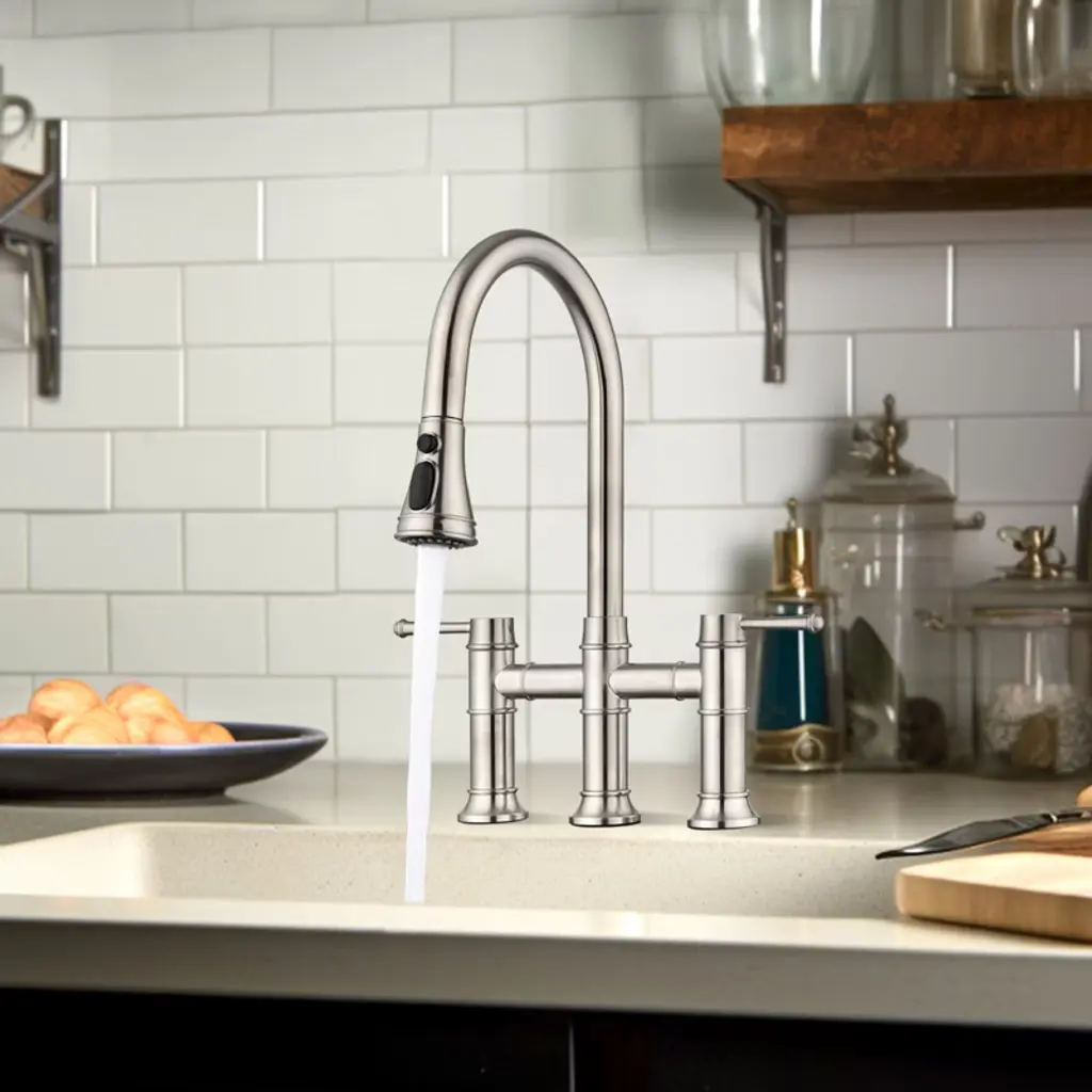 Proox Double Handle Bridge Kitchen Faucet In Brushed Nickel