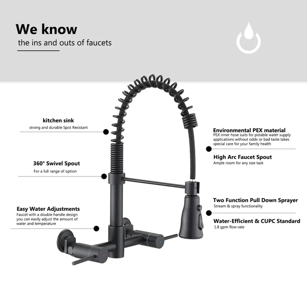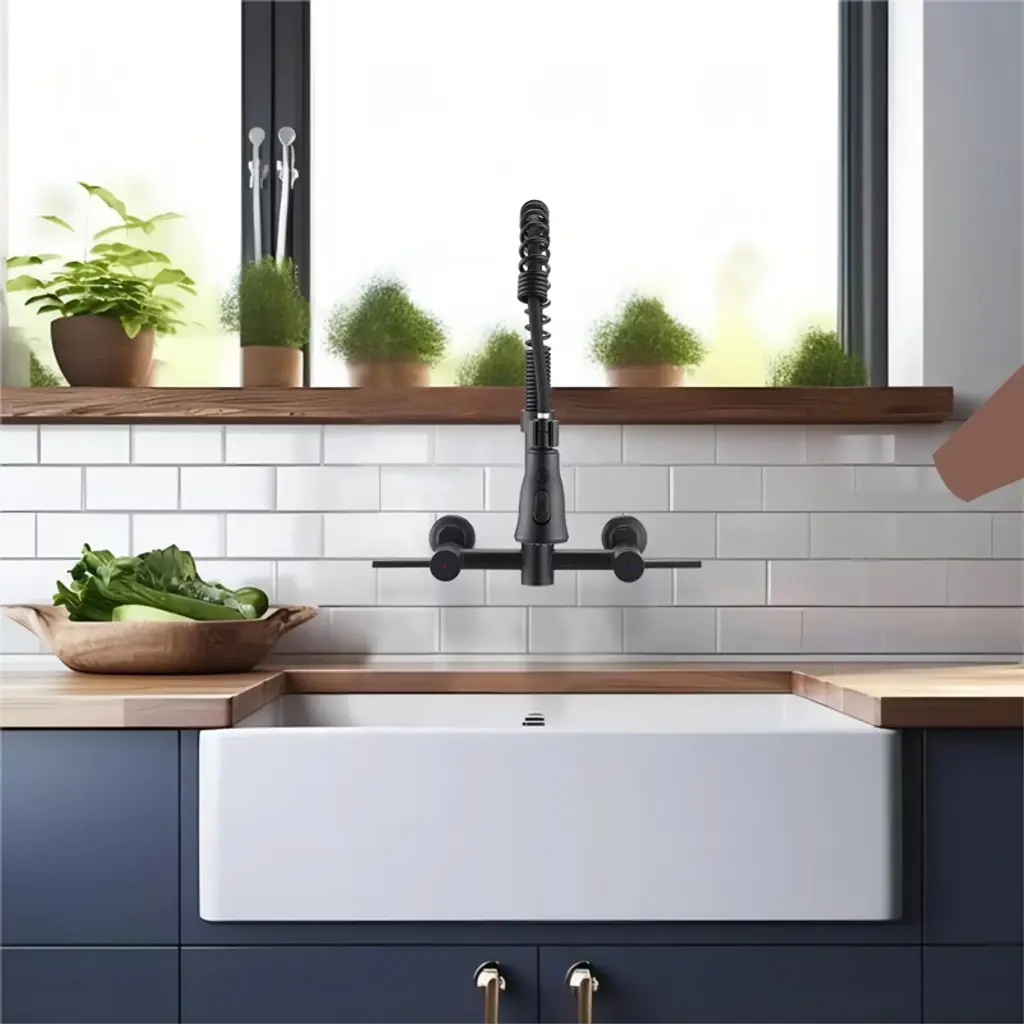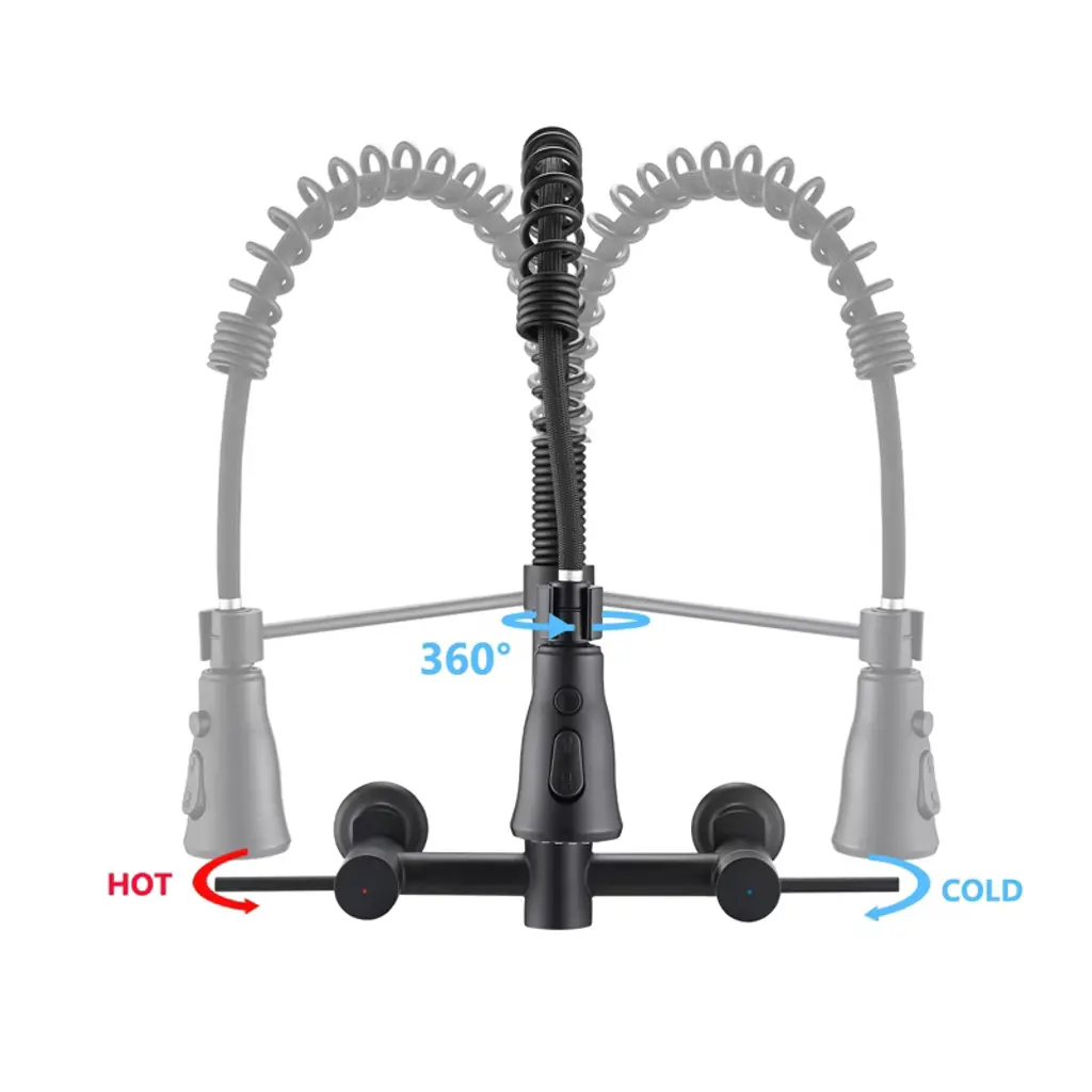 This highly sought-after Wall Mounted Bridge Kitchen Faucet is renowned for its innovative design and versatile sprayer. With a double lever handle for precise control over water volume and temperature, the high-arch swing spout incorporates a 3-function spray head for effortless operation. Crafted from durable stainless steel, this faucet is both scratch-resistant and stain-proof, ensuring long-lasting performance. Its bold, contemporary design sets it apart from traditional faucets, making it a perfect fit for any modern kitchen style.