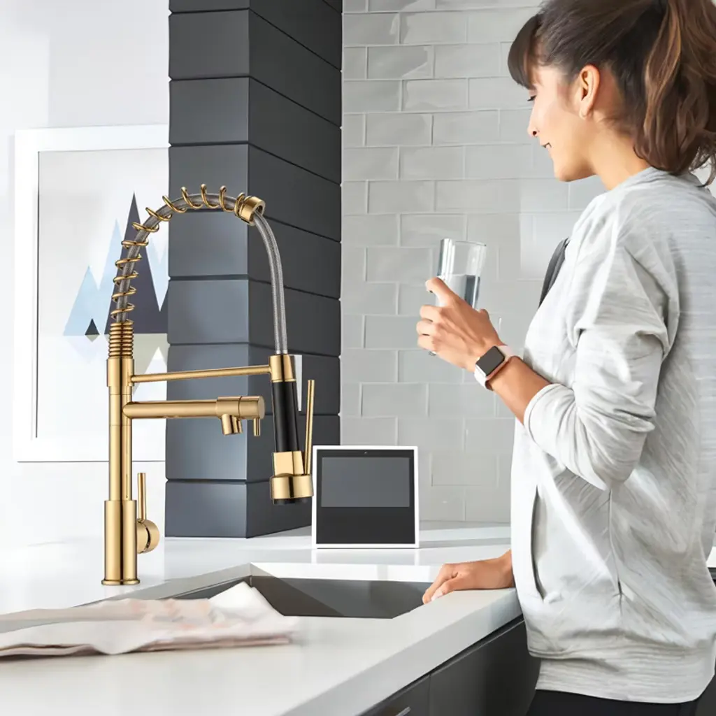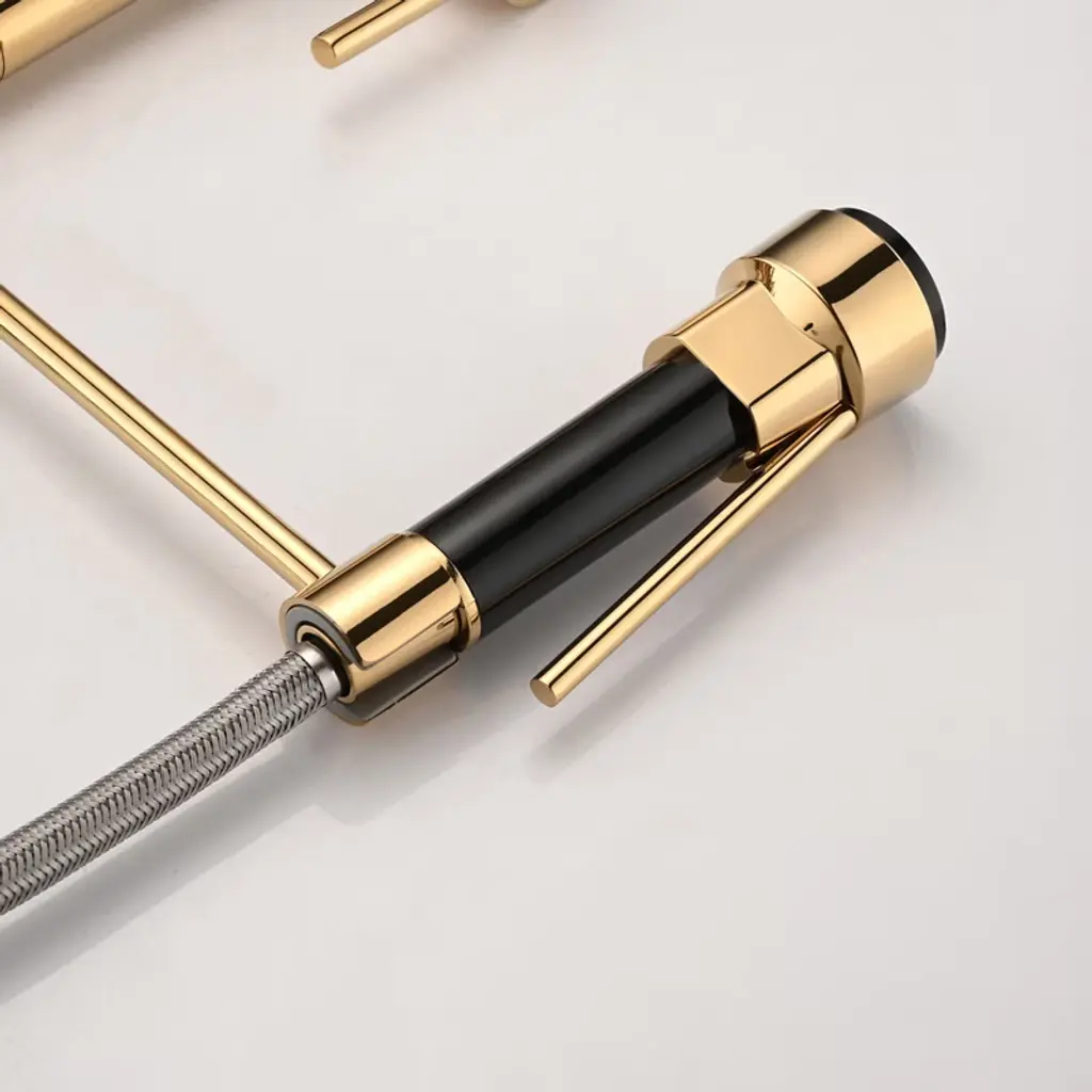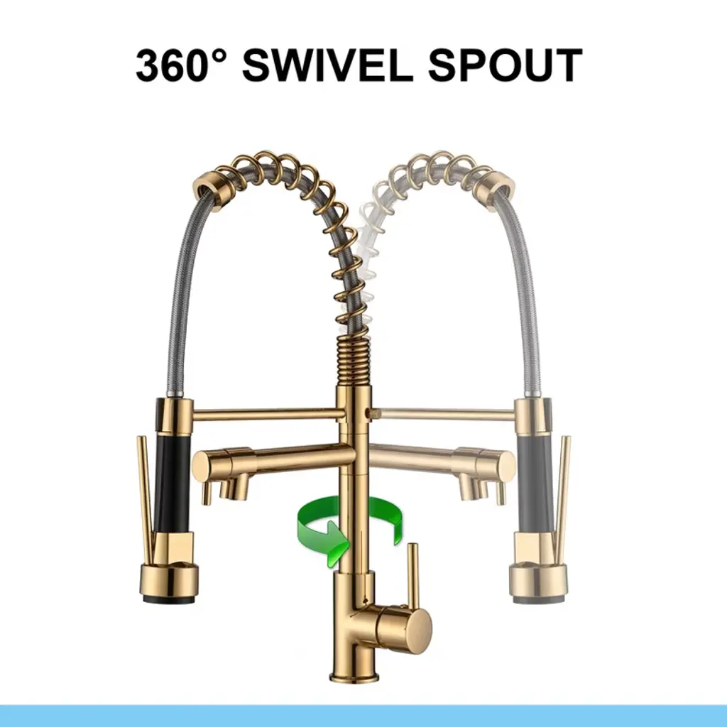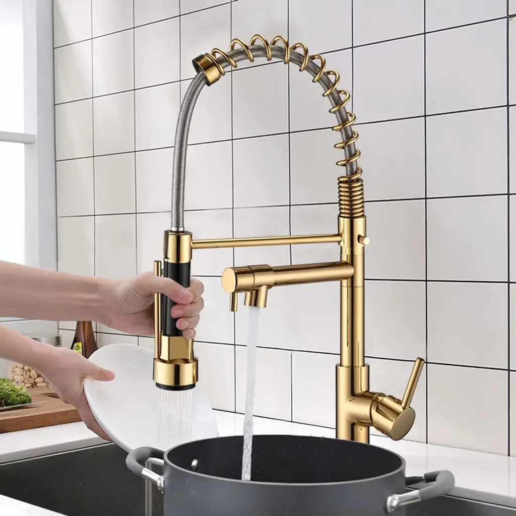 Proox Single Handle Deck Mount Spring Pull Down Sprayer Kitchen Faucet With Pot Filler In Polished Gold
