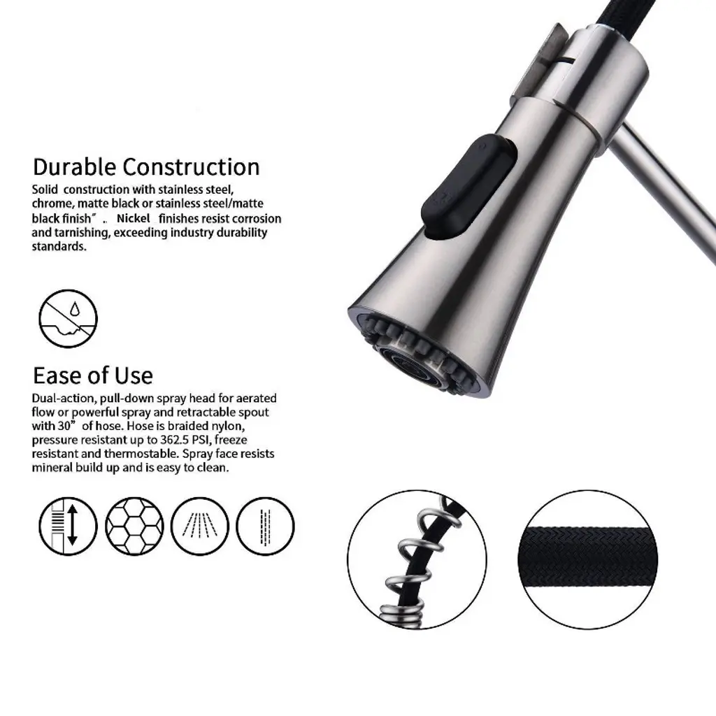 Perfect for a stylish update, the Kitchen Faucet features a high-arching, pull-down spring spout. Its dual-function sprayer switches seamlessly from an aerated stream to powerful rinse at the push of a button, making this fixture ideal for a variety of tasks. The retractable hose and swiveling spout allow you to reach all corners of your sink with ease. Made of stainless steel and boasting a corrosion-resistant finish, the spring faucet will be a lasting addition to your home.