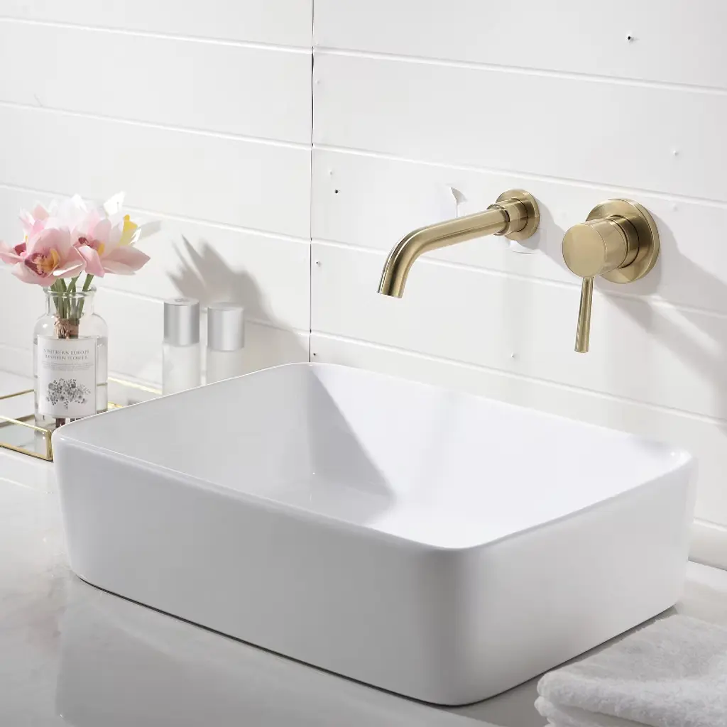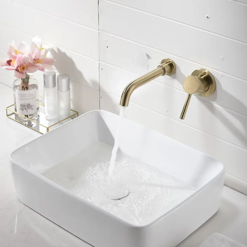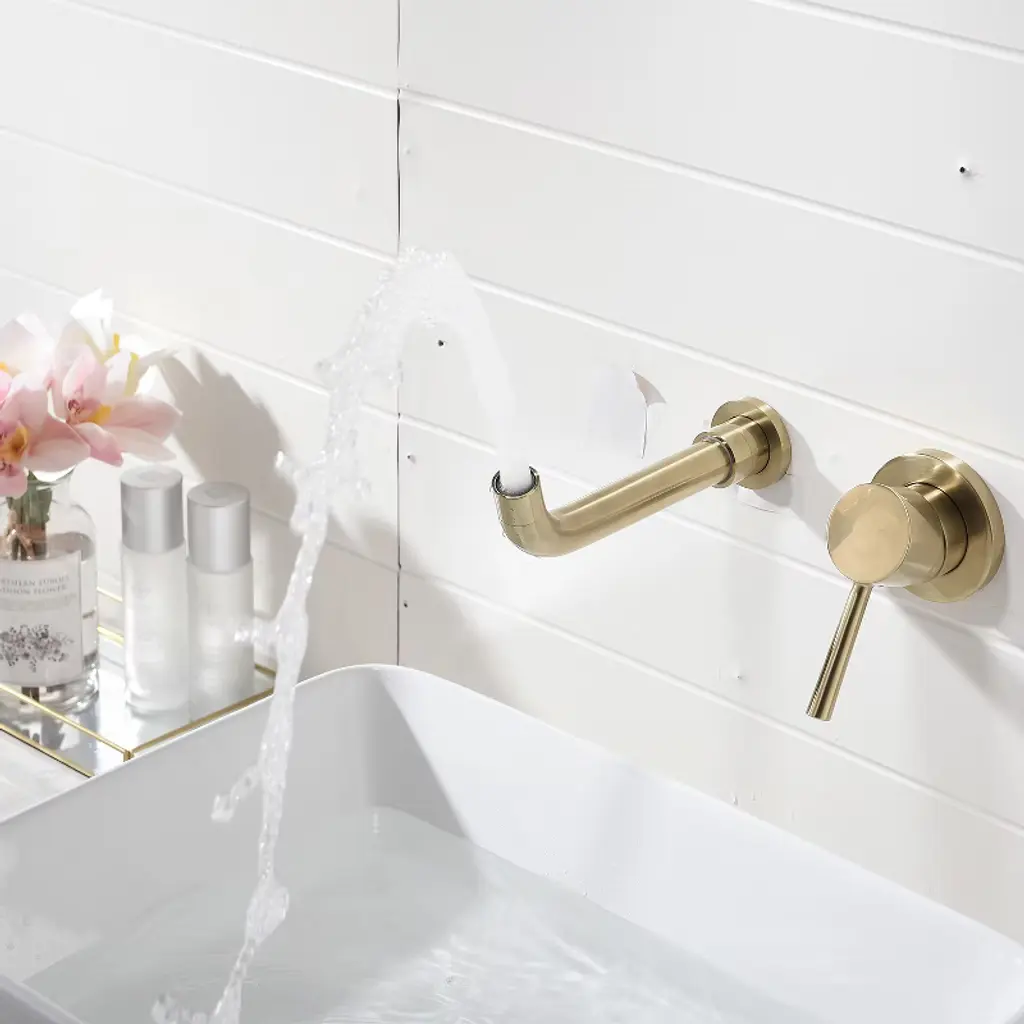 This elegantly designed wall mount sink faucet is crafted from solid brass, ensuring exceptional durability and long-lasting reliability. Finished with a high-quality brushed gold coating, it boasts a corrosion-resistant surface that withstands the test of time. This wall-mount faucet provides a chic solution for saving valuable counter space while seamlessly blending style and functionality. Drawing inspiration from the sleek elegance of modern European design, it adds a touch of sophistication to any bathroom or kitchen setting.