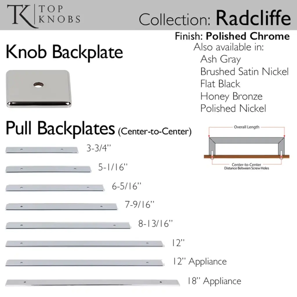 The universal style of the Radcliffe backplate suite allows for mixing and matching to create a seamless and polished look for any project. Conceal any existing marks or holes on your cabinet surface with ease using this 6 5/16" backplate from the Radcliffe collection from Top Knobs. The universal style allows for mixing and matching to create a seamless and polished look for any project. From kitchens and bathrooms to laundry rooms and home offices, Top Knobs decorative cabinet hardware continues to shape home design. Top Knobs offers the most extensive line of premium cabinet hardware allowing the creative freedom to complete the perfect look. Leave the finishing touch to the brand designers trust!