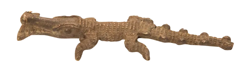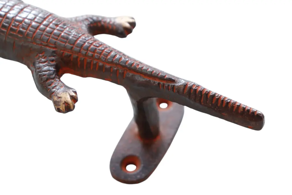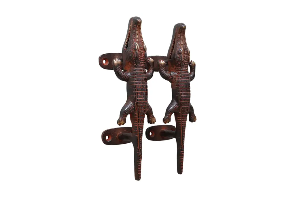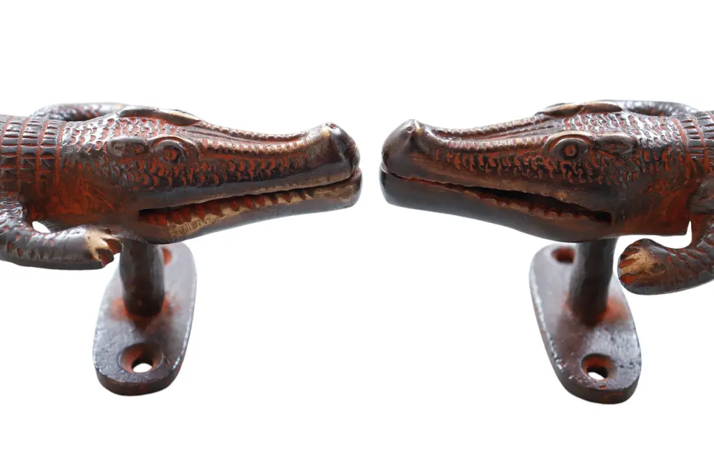 A pair of red brass alligator door handles or cabinet pulls. Pressed with simple details to convey skin, eyes and toes. Dimensions per handle.