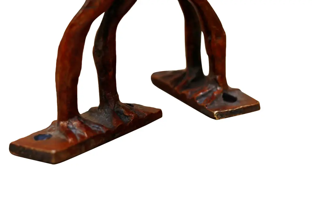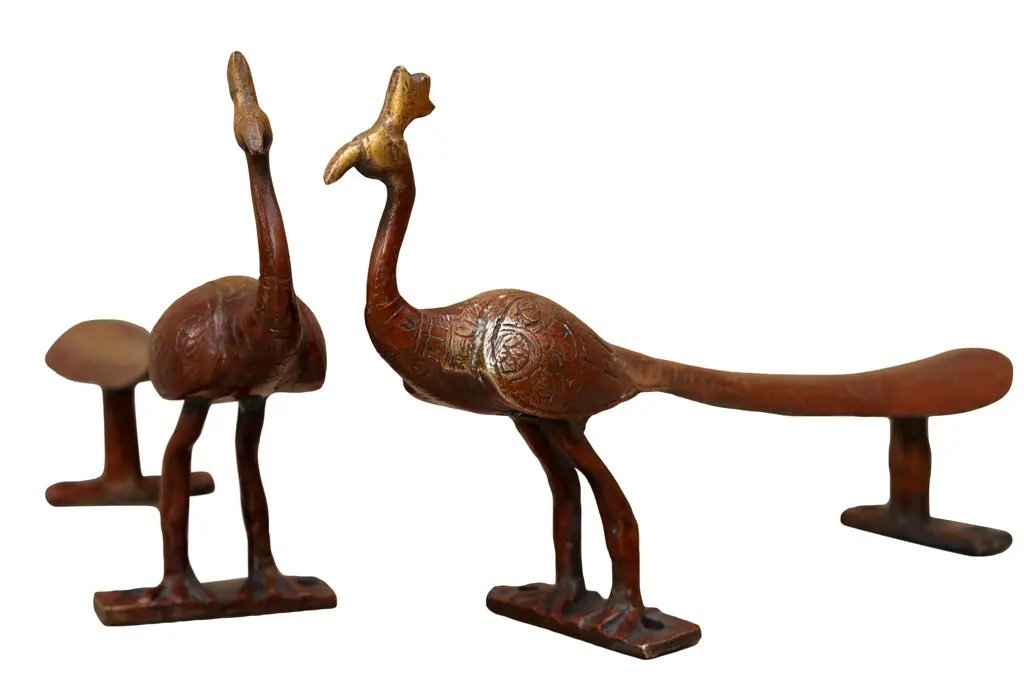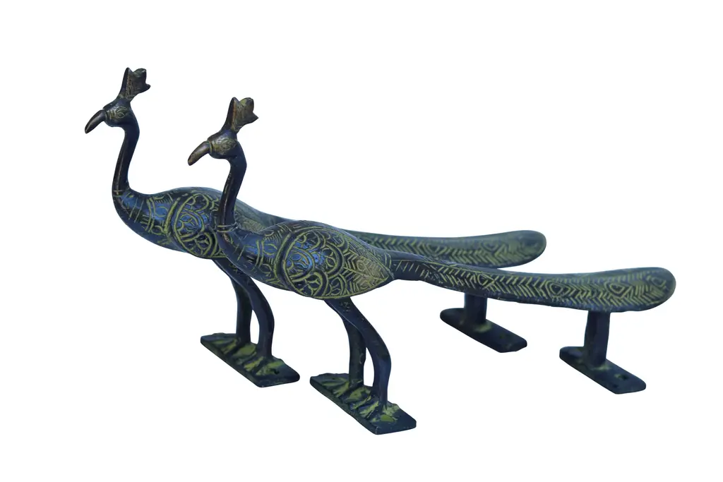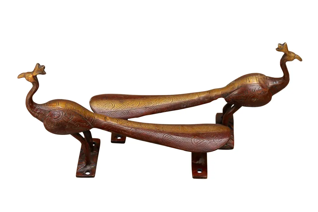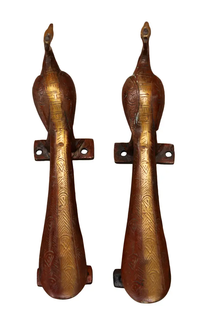 A pair of red and gold brass peacock door handles or cabinet pulls. Cast with intricate line details throughout. Dimensions per handle.