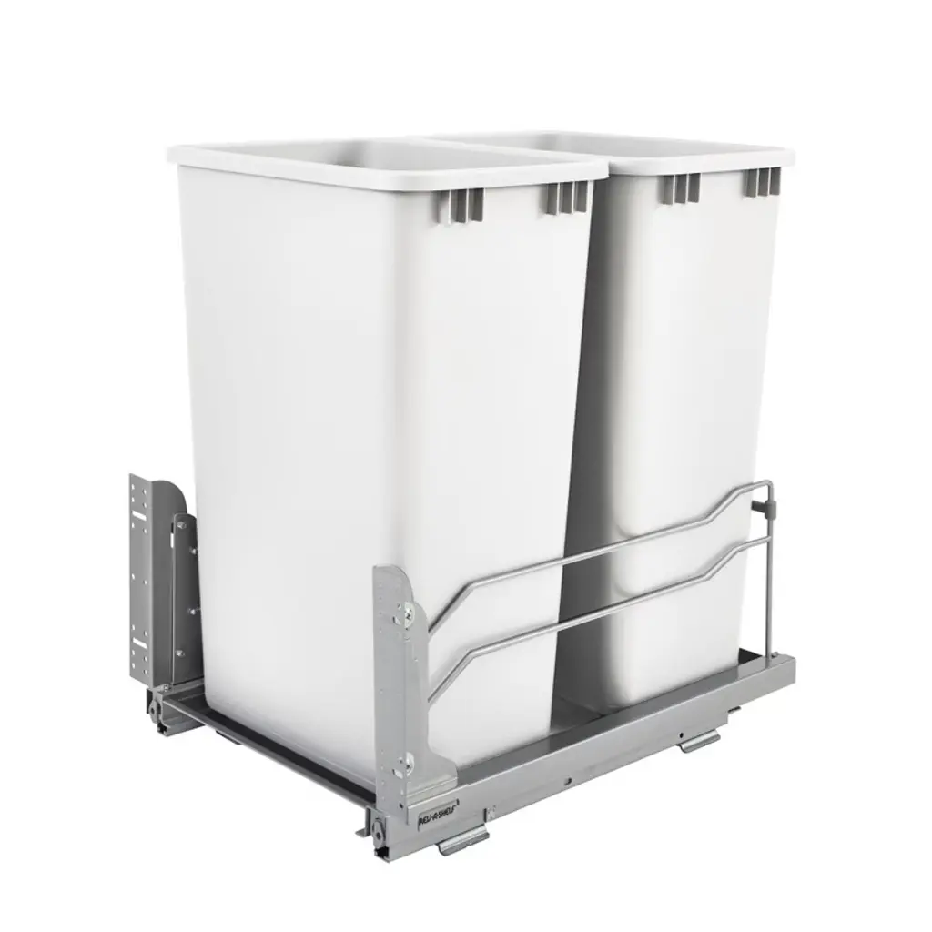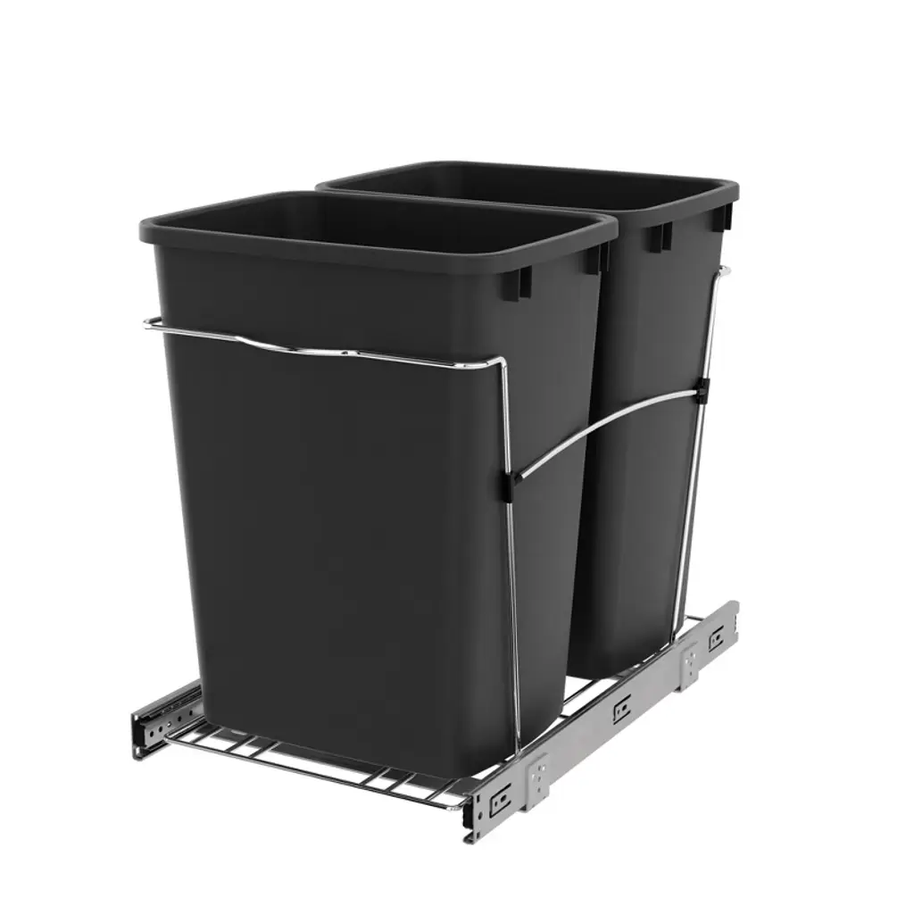 Keep your trash out of sight and make it easy on yourself to keep your kitchen or laundry room clutter-free with the Rev-A-Shelf Bottom Mount Pullout Waste Trash Container. The 4WCBM Series Waste Containers are the only bottom mount units available with Rev-A-Shelf’s patent pending Rev-A-Motion soft-open and soft-close slide system. The innovative gas spring assisted soft-open allows the unit to open smoothly and the soft-close shuts softly, even under the heaviest of loads. All units feature metallic silver waste containers and built-in door mount brackets. The 4WCBM is easy to install with only five screws and features a beautiful dovetail constructed frame, and concealed 150 pound slides for a clean look. Double check your cabinet's opening (inside dimensions) to allow the best fit. Measure side to side (width), front to back (depth or length), and top to bottom (height). Double check to make sure your product is within measurements and don't forget to take into account any obstructions (plumbing, hinges, etc.). Beautify your kitchen and keep your trash cans hidden under the counter with the Rev-A-Shelf Base Cabinet Pull Out Waste Containers.