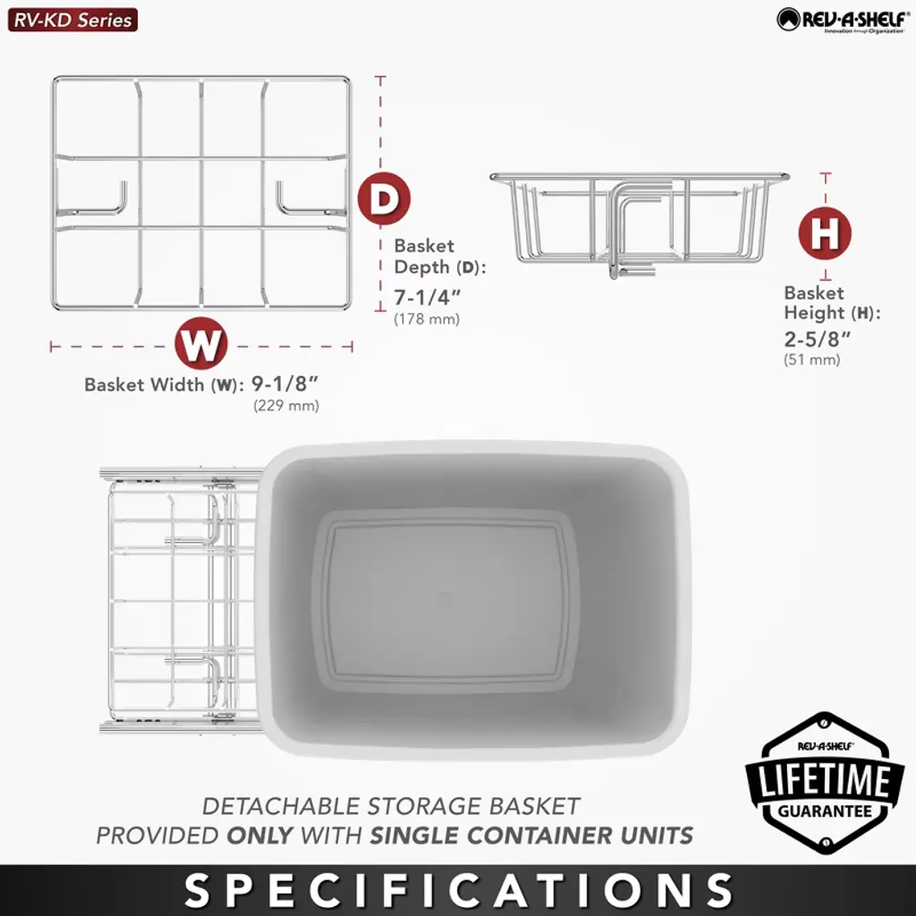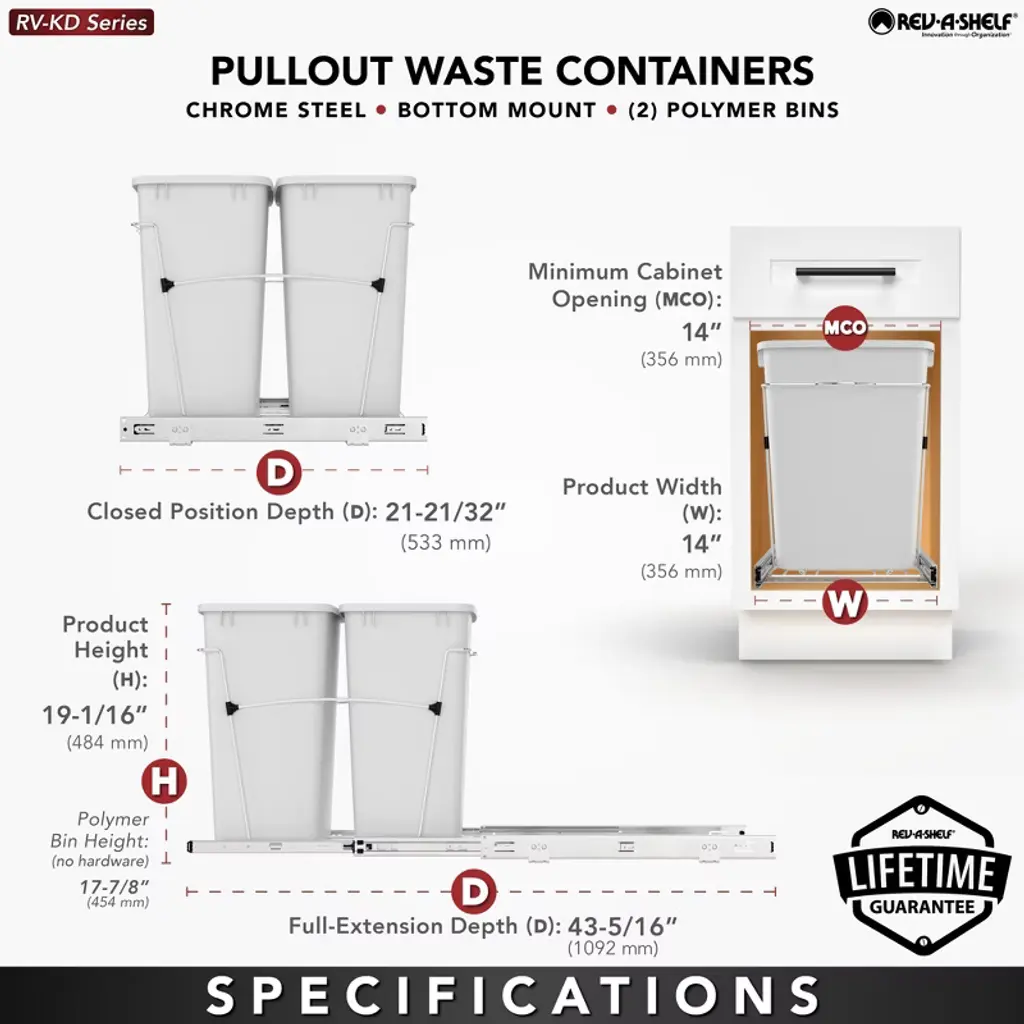 Rev-A-Shelf knows waste containers better than anyone in our industry and the RV series is perfect for anyone wanting to replace your existing floor standing trash can and create more space in your kitchen. Featuring a large capacity, you'll spend more time enjoying your clean kitchen and less time taking out the waste or recycling items. This space-saving trash container system comes with all the hardware you need to install it easily and quickly to the cabinet floor. The handle can be removed if you prefer to mount the system to the cabinet door with the 5WB-DMKIT (sold separately). Once installation is complete, these sliding trash containers glide effortlessly on a 3-piece zinc plated full-extension ball-bearing slide system. These two pullout bins use standard 12-gallon trash bags. Designed for a base cabinet with an opening width of 14.5”- 18”. The heavy gage plated metal wire construction ensures that this pullout system will last for years to come. Double check your cabinet's opening (inside dimensions) to allow the best fit. Measure side to side (width), front to back (depth or length), and top to bottom (height). Double check to make sure your product is within measurements and don't forget to take into account any obstructions (plumbing, hinges, etc.). Enjoy a spacious, functional kitchen, thanks to these Rev-A-Shelf Pullout Trash Bins.