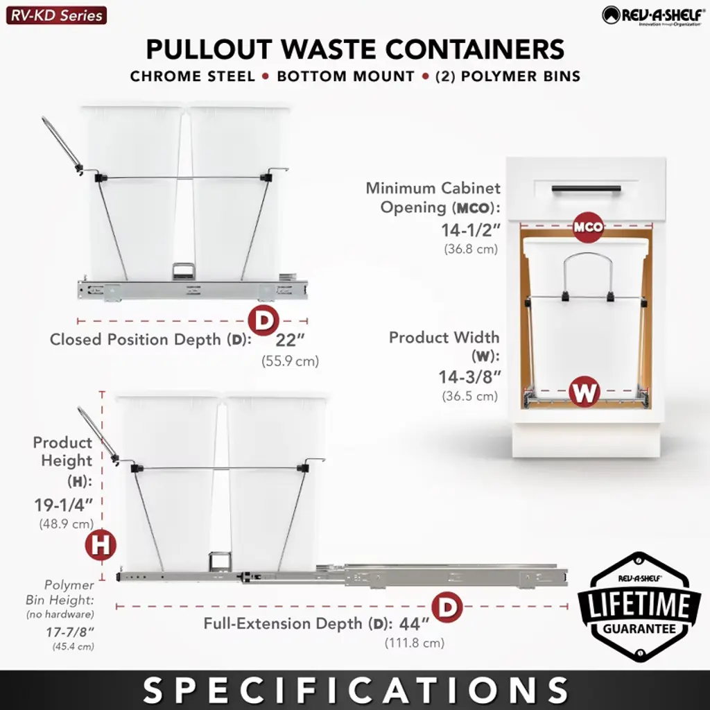 Rev-A-Shelf knows waste containers better than anyone in our industry and the RV series is perfect for anyone wanting to replace your existing floor standing trash can and create more space in your kitchen. Featuring a large capacity, you'll spend more time enjoying your clean kitchen and less time taking out the waste or recycling items. This space-saving trash container system comes with all the hardware you need to install it easily and quickly to the cabinet floor. The handle can be removed if you prefer to mount the system to the cabinet door with the 5WB-DMKIT (sold separately). Once installation is complete, these sliding trash containers glide effortlessly on a 3-piece zinc plated full-extension ball-bearing slide system. These two pullout bins use standard 12-gallon trash bags. Designed for a base cabinet with an opening width of 14.5”- 18”. The heavy gage plated metal wire construction ensures that this pullout system will last for years to come. Double check your cabinet's opening (inside dimensions) to allow the best fit. Measure side to side (width), front to back (depth or length), and top to bottom (height). Double check to make sure your product is within measurements and don't forget to take into account any obstructions (plumbing, hinges, etc.). Enjoy a spacious, functional kitchen, thanks to these Rev-A-Shelf Pullout Trash Bins.