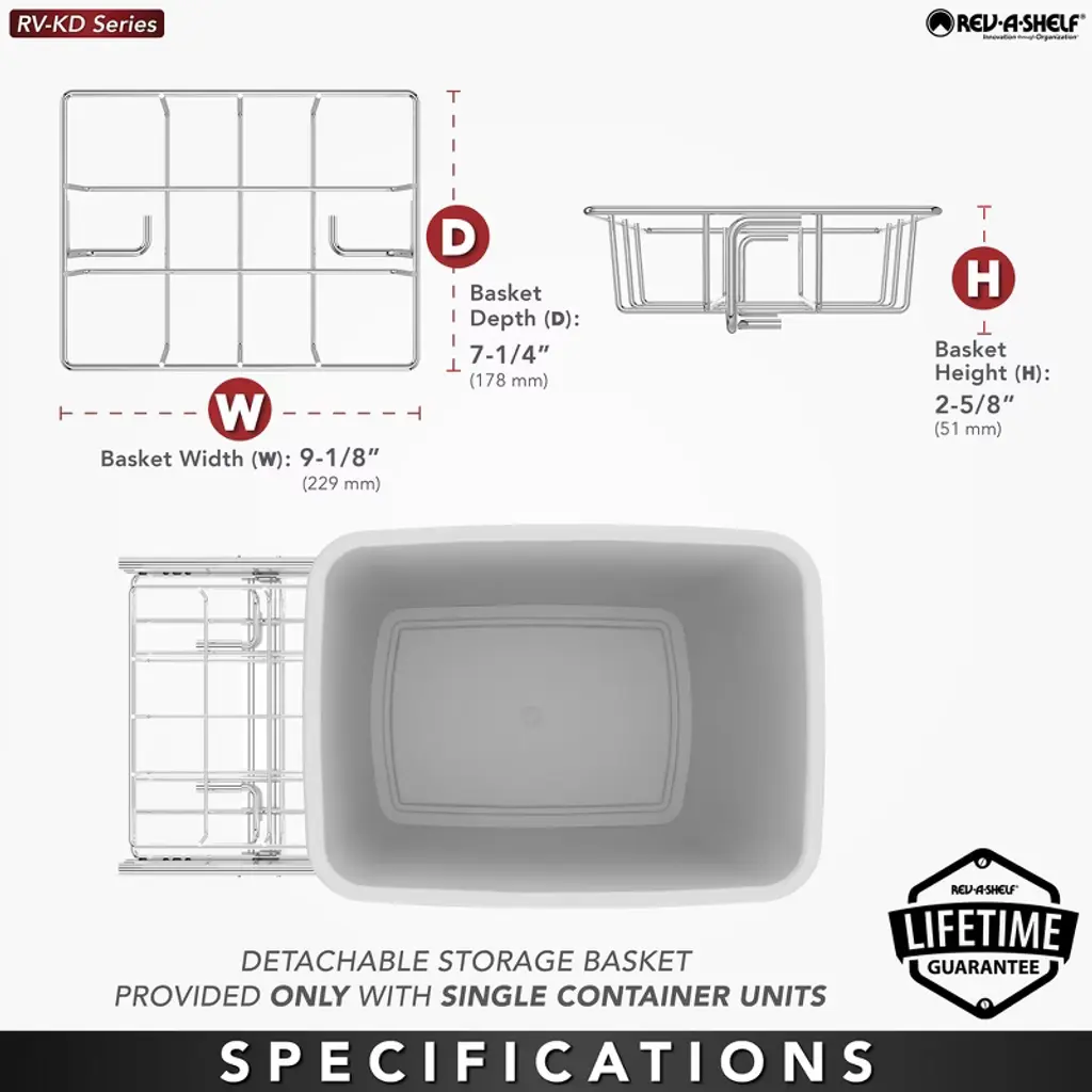 Keep your home looking neat and tidy. With the Pull-out Cabinet Waste Container from Rev-A-Shelf, you'll no longer have to worry about your unsightly trash or recycling can being in the way. Enjoy the convenience of simply pulling out your garbage waste bin to dispose of anything in your kitchen without having to worry about it being exposed in your home. This sliding waste container is designed for absolute sturdiness with a heavy-duty, metal construction. With the included mounting hardware and ball-bearing slides, installation is simple. This waste container will mount to the bottom of your cabinet. Supporting up to 100 pounds, access your waste container solution worry-free by sliding back and forth with ease thanks to the included, removable handle. Intended for full-height cabinets that have an opening that is at least 11 inches wide. Double-check your wall's measurements to allow the best fit. Measure side to side, front to back, and top to bottom. Double-check to make sure your product is within measurements and don't forget to take into account any obstructions. Hide unwanted trash and recycling away and out of sight with the Rev-A-Shelf Cabinet Pull-out Waste Container.