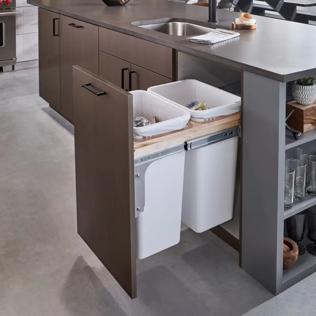 When it comes to home decor, your trash container can pose a challenge. If space and aesthetics are an issue, then you need the Rev-A-Shelf Pull-Out Trash Container Bin. Enjoy the convenience to simply pull out your waste bin to dispose of anything in your kitchen, without having to worry about it being exposed in your kitchen. This is an easy-to-install design for no-fuss set-up designed for a cabinet opening of exactly 16.5 inches. These waste containers are designed for absolute sturdiness with front and rear adjustable mounting, pre-installed door mount brackets, and full-extension 150 pound rated ball-bearing slides for total stability. This trash container’s modern maple exterior even complements your kitchen while the durable finish lasts the long haul. Enjoy a spacious, functional kitchen, thanks to the Rev-A-Shelf Pull-Out Trash Bin. Double-check your cabinet's opening (inside dimensions) to allow the best fit. Measure side to side (width), front to back (depth or length), and top to bottom (height). Double-check to make sure your product is within measurements and don't forget to take into account any obstructions (plumbing, hinges, etc.).