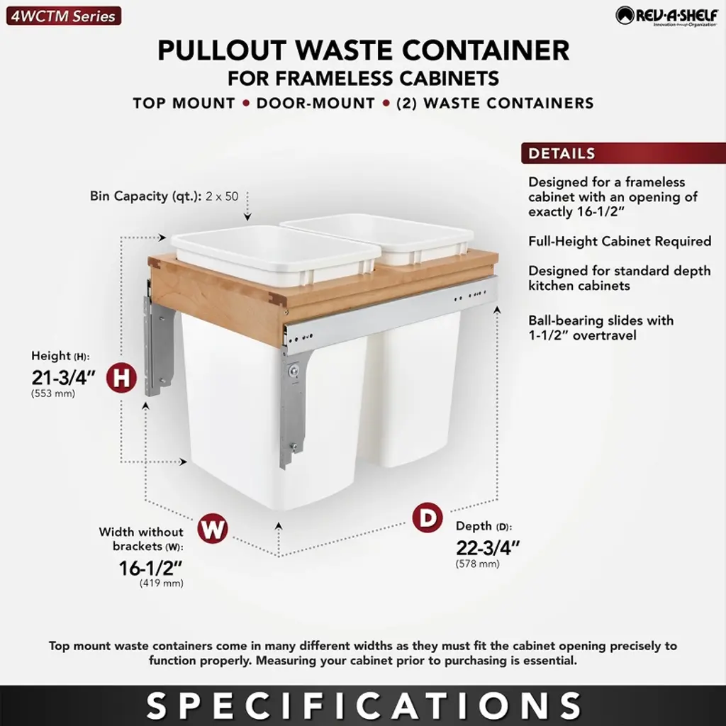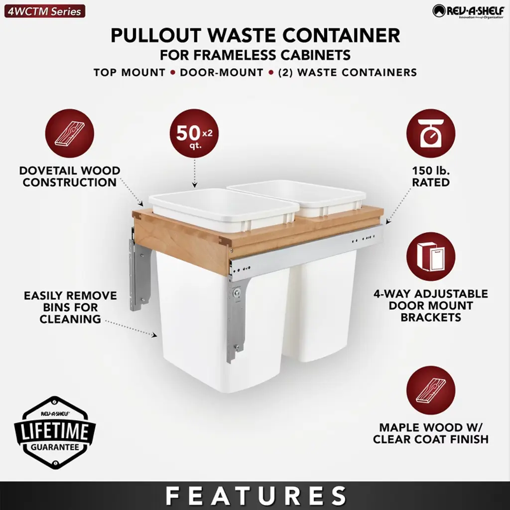 Rev-a-shelf Single Pullout Trash Can For Full Height Kitchen Cabinet 50 Quart 12.5 Gallon, Top Mount 15.5 Inch Wide, White, 4Wctm-1850dm2-419-fl