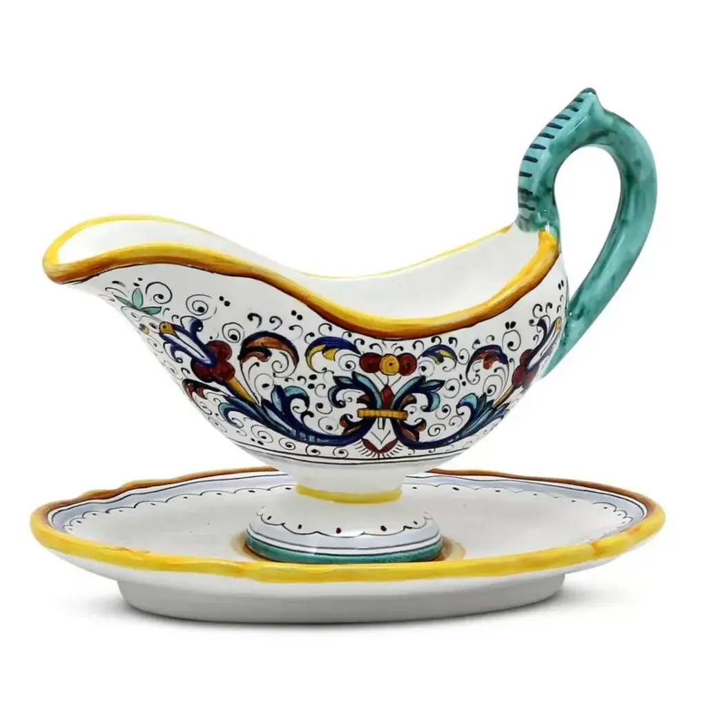 RICCO DERUTA: Artistica's Ricco Deruta is the true original version of the most celebrated Deruta's design, which traces its origins to the sixteenth century. Masterfully hand painted with the original royal blue, yellow gold, and emerald green; traditional renaissance era colors to bring royal elegance to your table. Size (inches): 6.75 Long. x 3.5 WIDE x 5 HIGH (8.5 Long with handles)