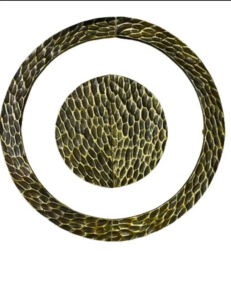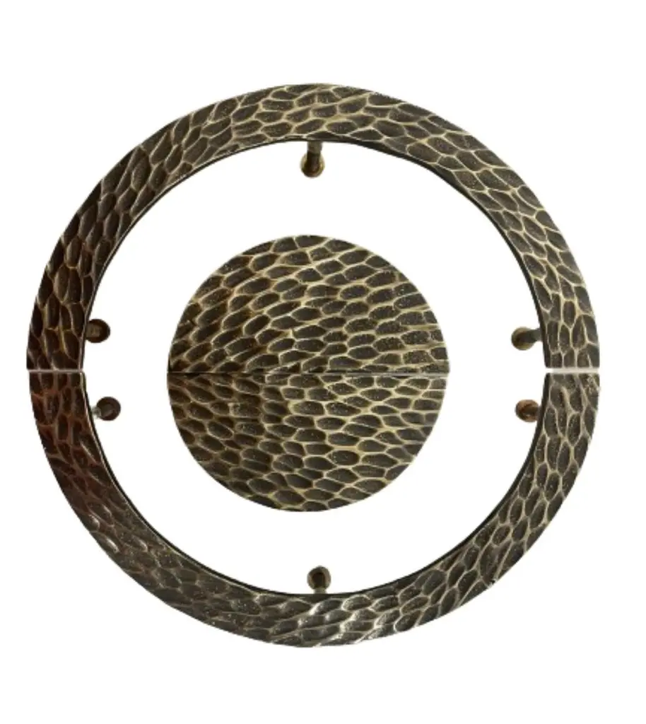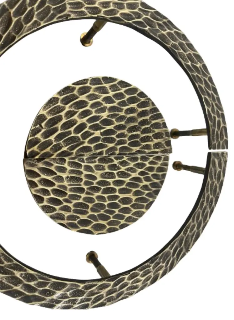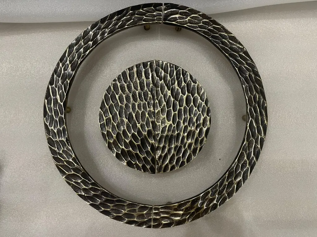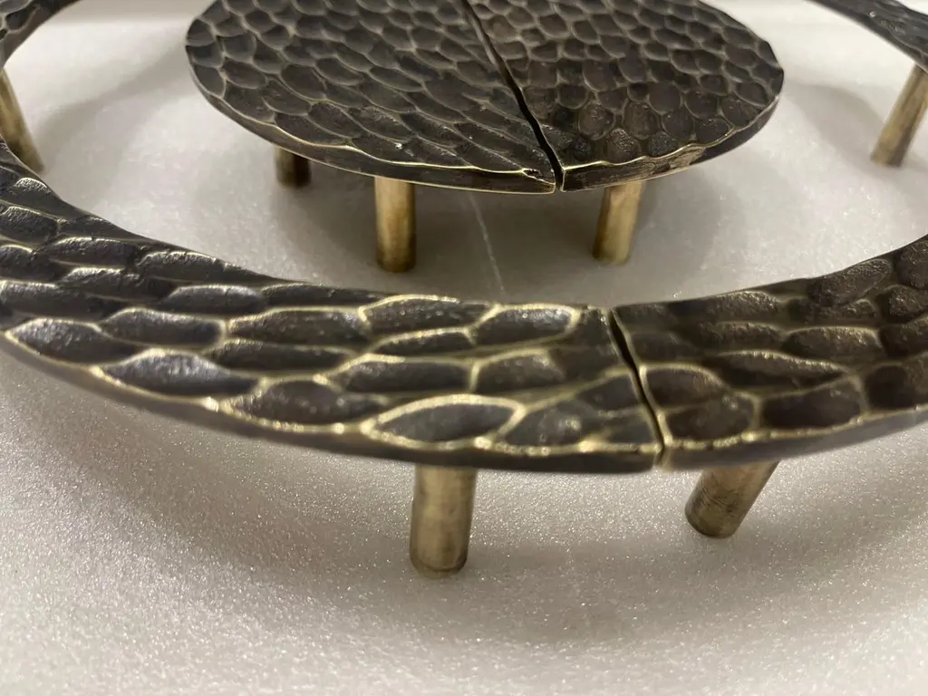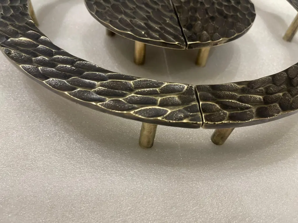The Rizo Hive door pull set in brass features a handcrafted surface design reminiscent of a honeycomb pattern, giving it a unique and tactile appearance. The rich brass materiality provides a warm, aged golden hue and adds a touch of elegance and durability. This Hive handle can be used in various applications such as cabinetry, doors, or furniture, enhancing the overall aesthetic with its intricate, nature-inspired design and sturdy, high-quality finish.Please Note: The one-of-its-kind Hive door pull may have variations in its form, texture, tonality and finish which are not imperfections but a testimony to the authentic artisanal production. Each piece is 100% unique & handcrafted, therefore, dimensions may vary slightly.