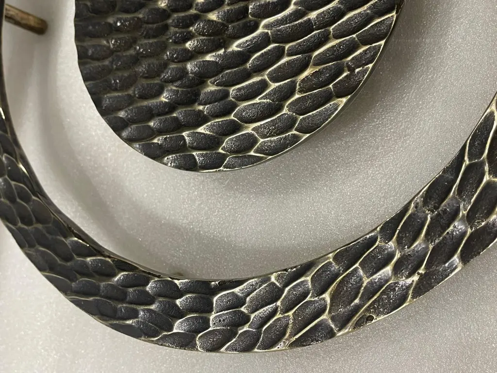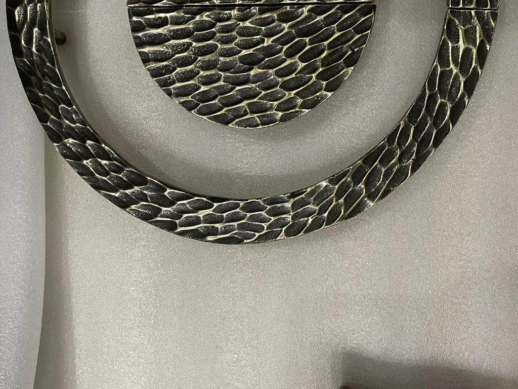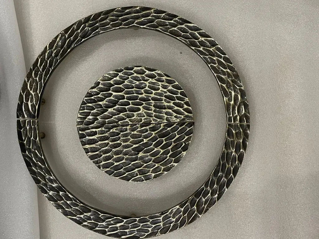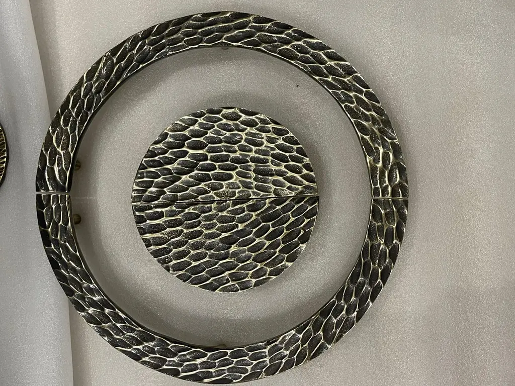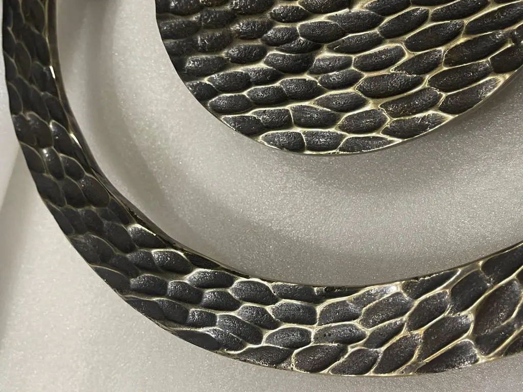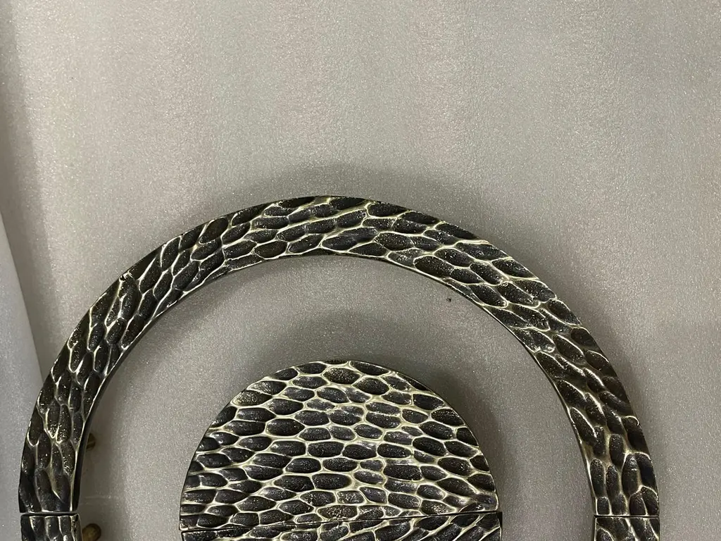 The Rizo Hive door pull set in brass features a handcrafted surface design reminiscent of a honeycomb pattern, giving it a unique and tactile appearance. The rich brass materiality provides a warm, aged golden hue and adds a touch of elegance and durability. This Hive handle can be used in various applications such as cabinetry, doors, or furniture, enhancing the overall aesthetic with its intricate, nature-inspired design and sturdy, high-quality finish.Please Note: The one-of-its-kind Hive door pull may have variations in its form, texture, tonality and finish which are not imperfections but a testimony to the authentic artisanal production. Each piece is 100% unique & handcrafted, therefore, dimensions may vary slightly.
