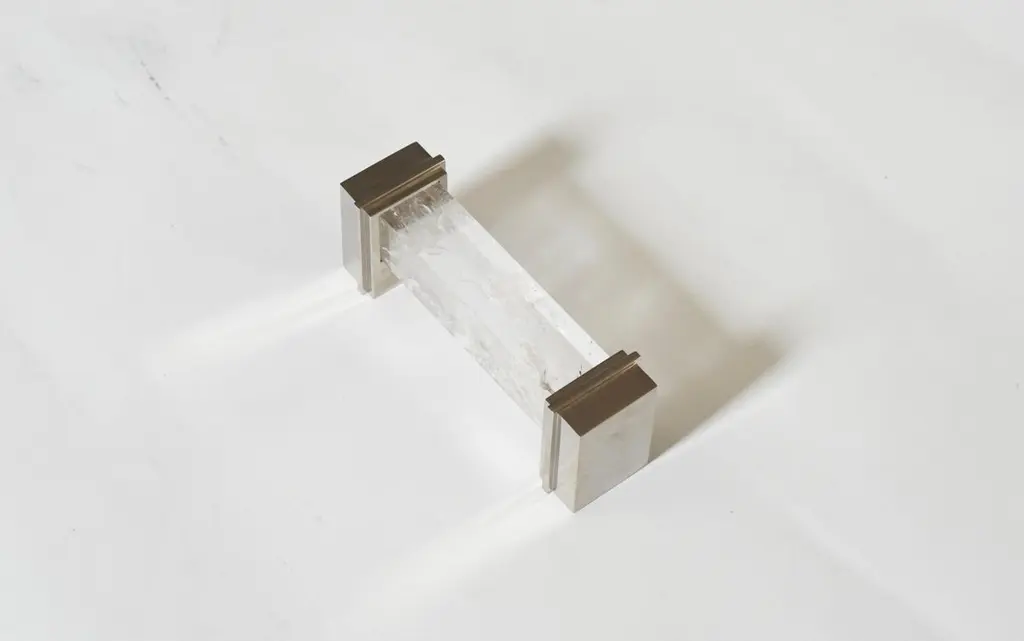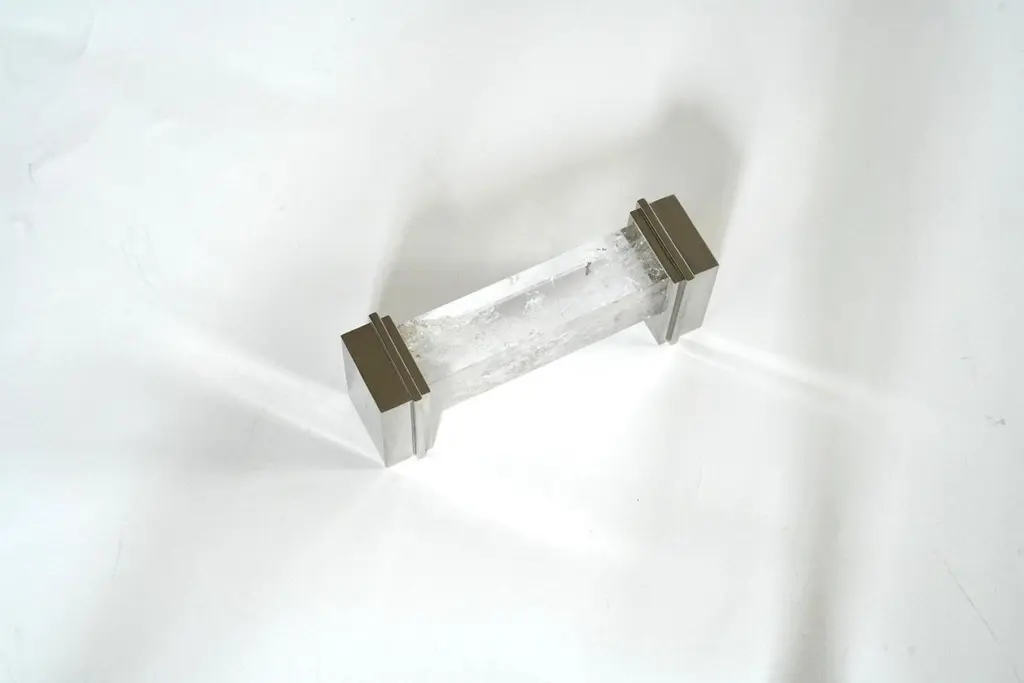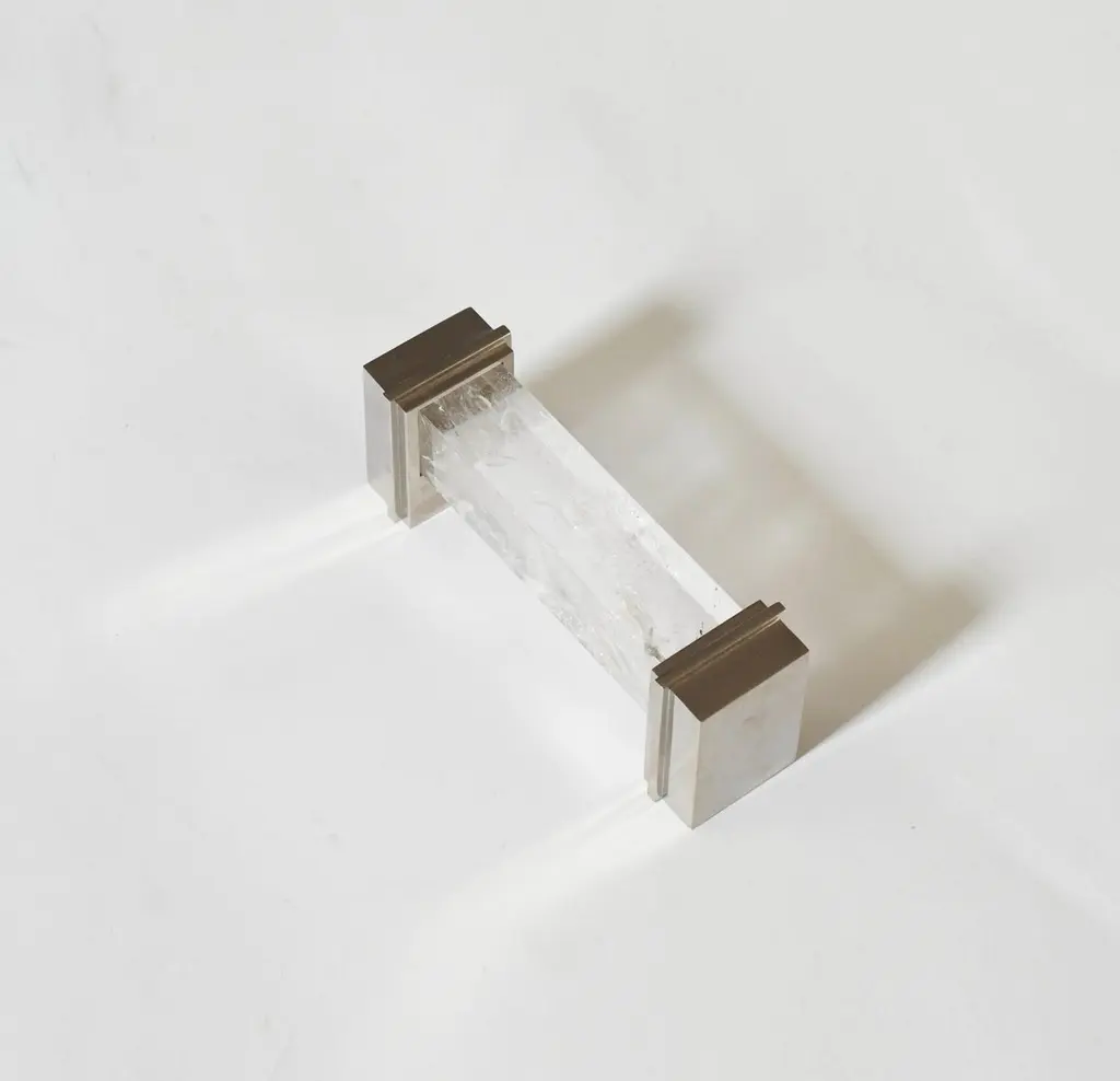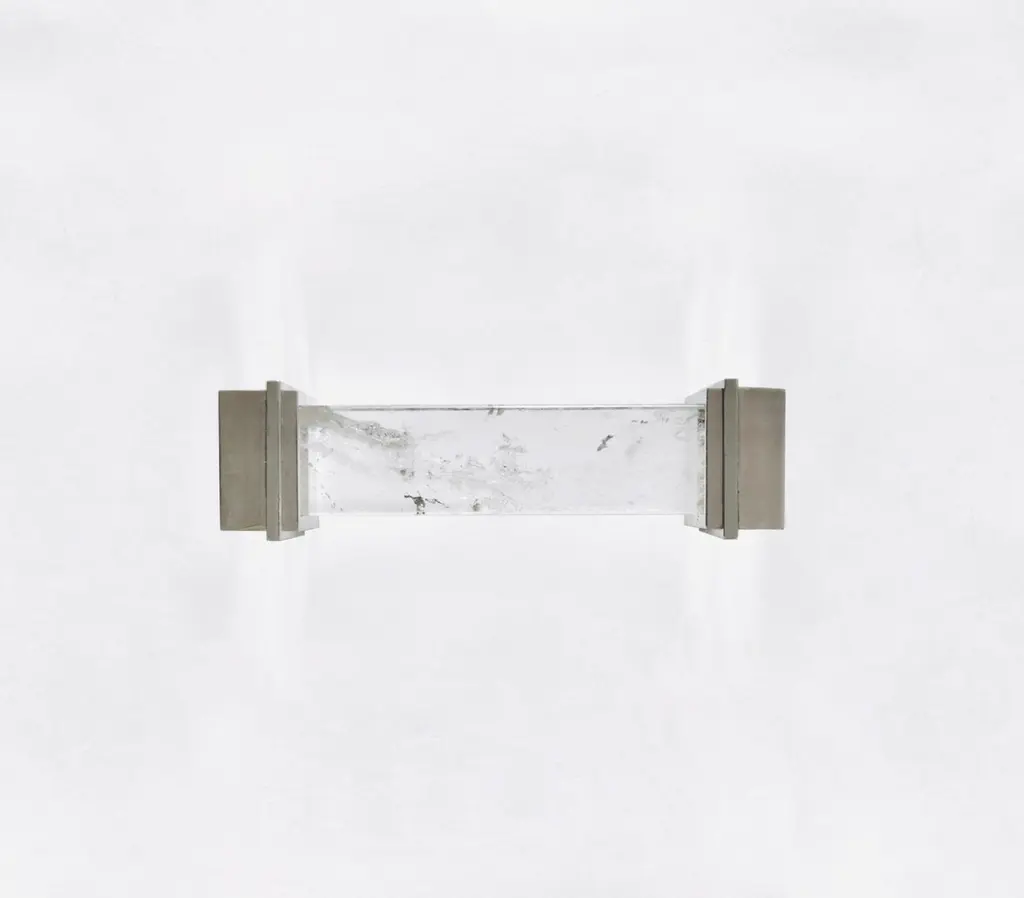 An elegant form rock crystal quartz handle with nickel plating finish. Created by Phoenix Gallery, NYC.Custom size, and metal finish upon request.