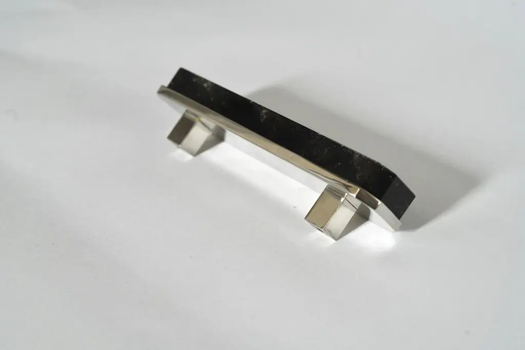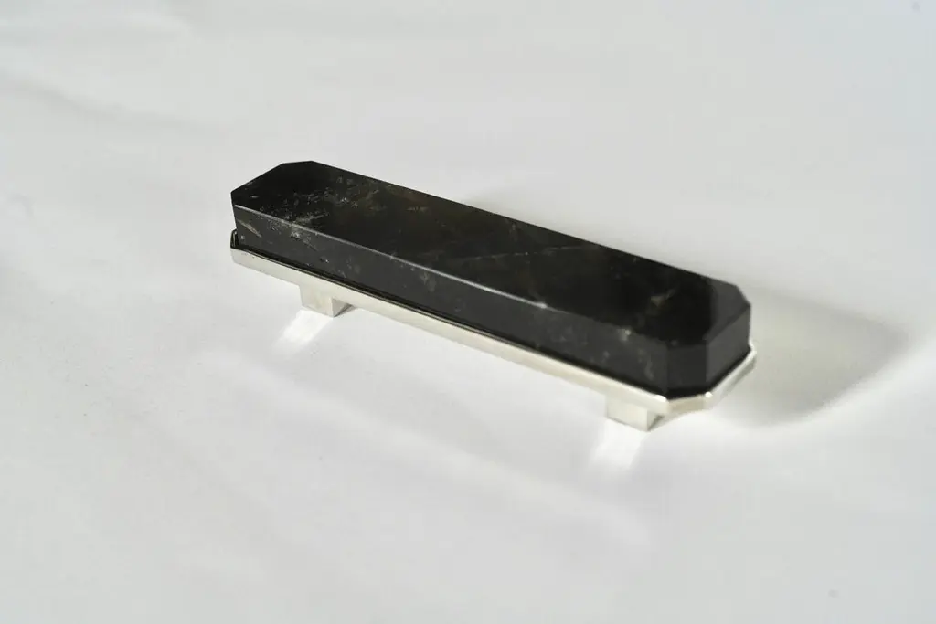 Octagon form smoky rock crystal handle with nickel plating decoration. Created by Phoenix Gallery, NYC.Size, and finish upon request.