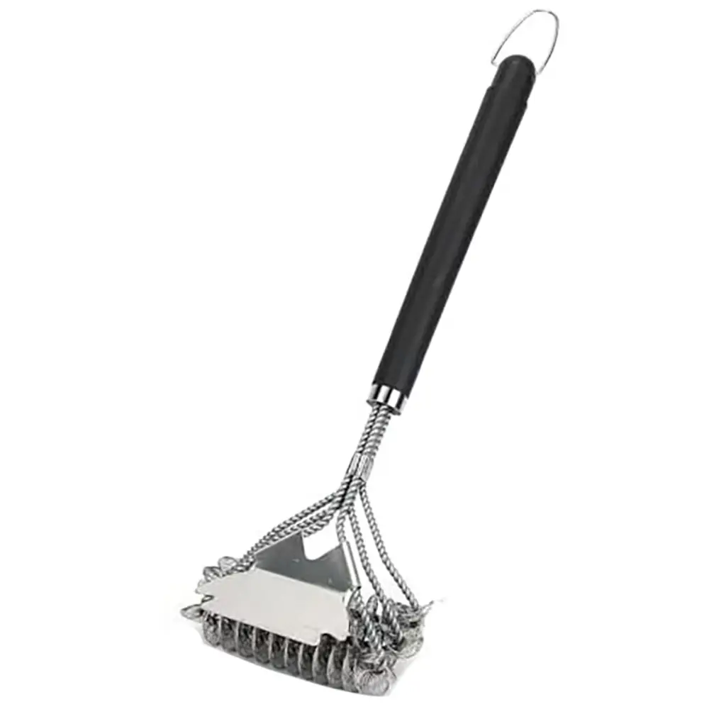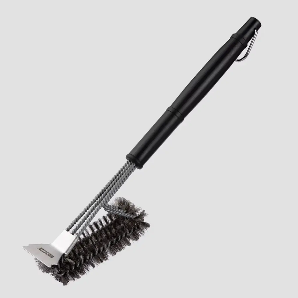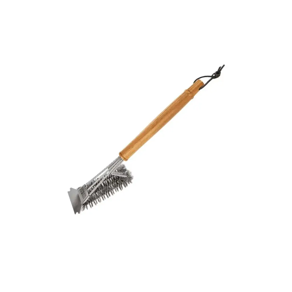 The accustomed griller will be primed to barbecue after cleaning with this traditional and dependable 3-in-1 grill brush. Apart of an extended family of tools, this essential tool is down to earth and projects attractive aesthetic features. The oversized head and ergonomic rosewood handle provides optimal comfort and control so you can attack the dirtiest of grills. This brush has all you need: durable brass bristles that are safe for all grill surfaces, a scrub pad, and a scraper for those tough, stuck-on messes. The convenient copper loop at the base of the handle allows for easy storage when not in use. This tool's traditional and down to earth feel makes it a natural fit for the griller at heart.