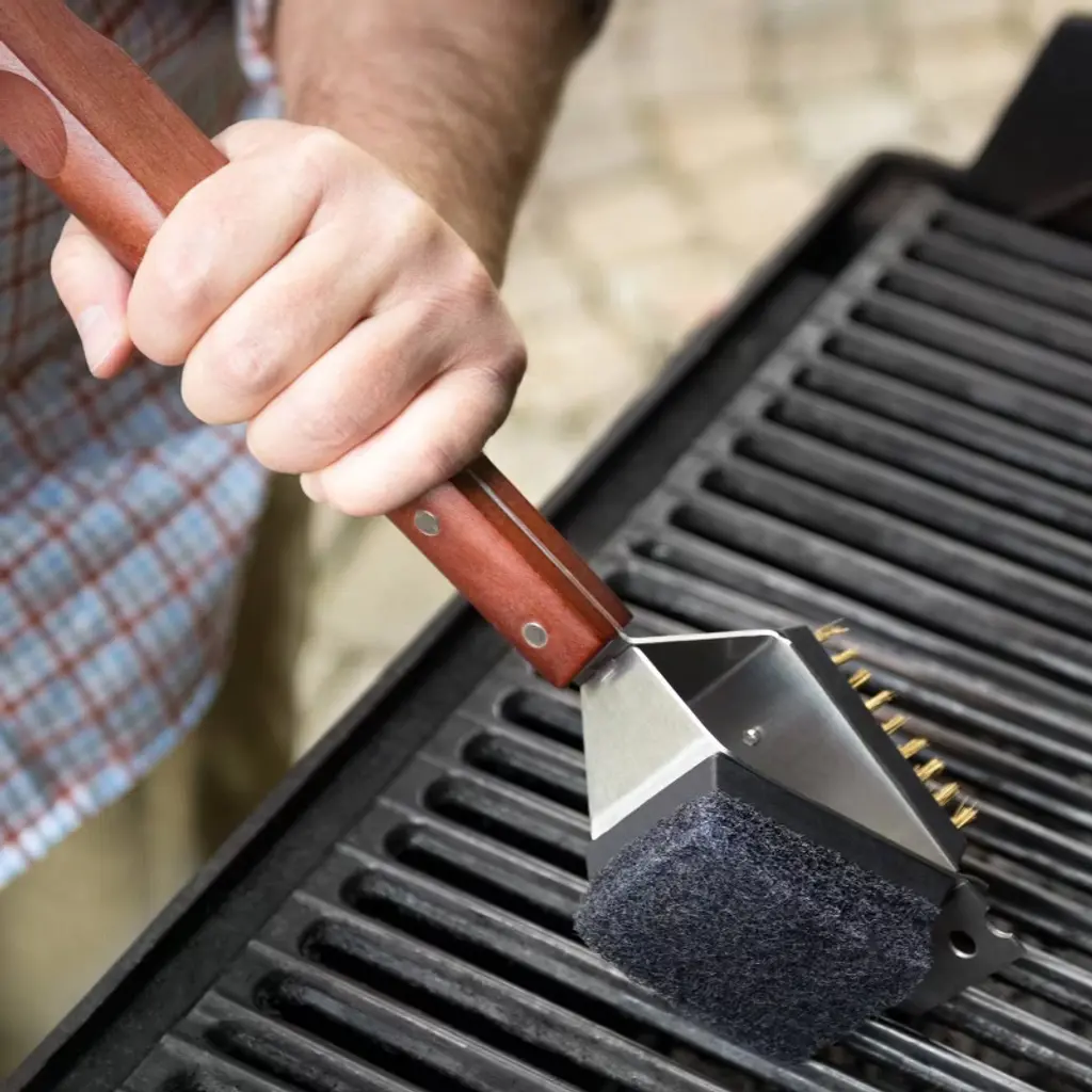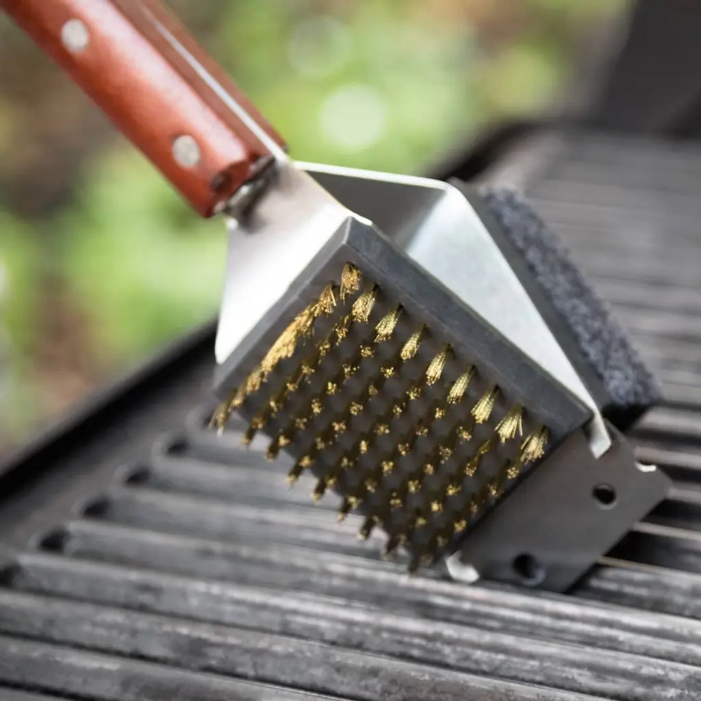 Rosewood 3-in-1 Grill Brush - Outset: Ergonomic Handle, Brass Bristles, Scrub Pad, Scraper, Bbq Cleaner