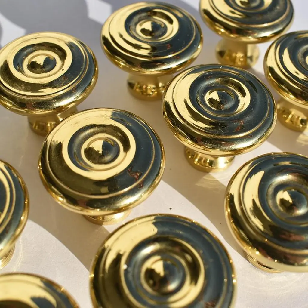 Vintage gold cabinet hardware knobs or drawer pulls in a beautiful gold. These round knobs are circular in shape, and flat on the top with concentric circle decor toward the center. The finish is a shiny brass or gold color. We have many available. These beautiful knobs would be a great addition to any bathroom or kitchen. A great way to update a space just before the holiday guests start coming in.