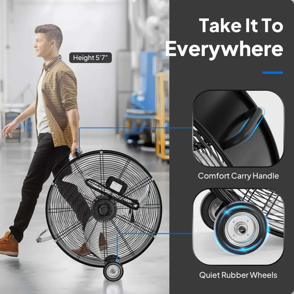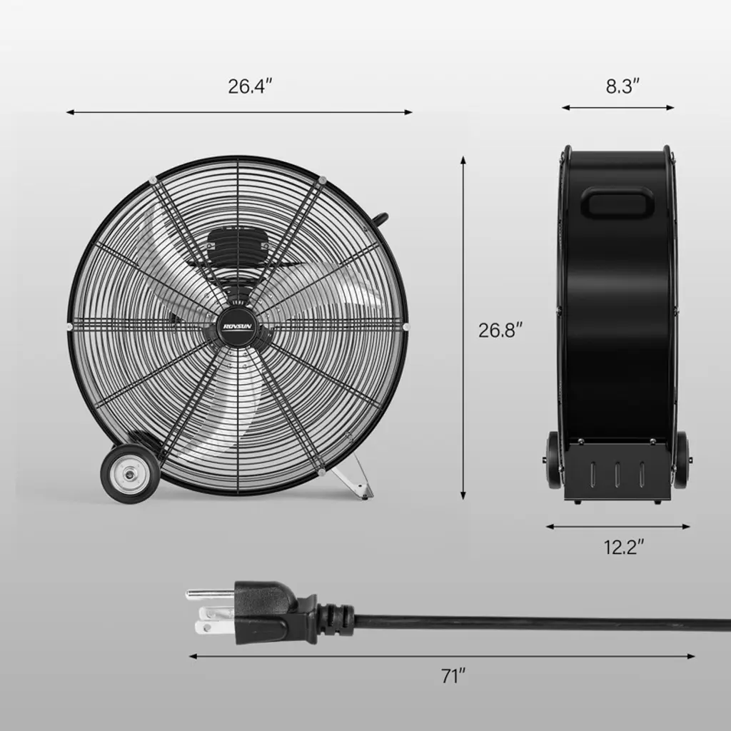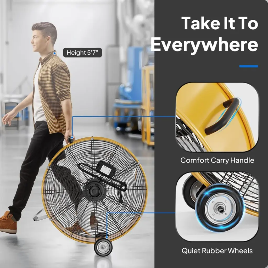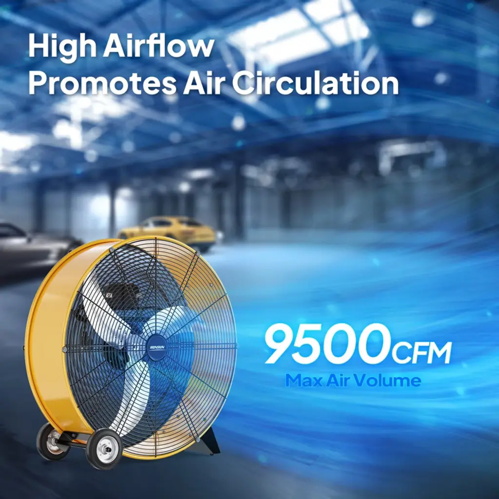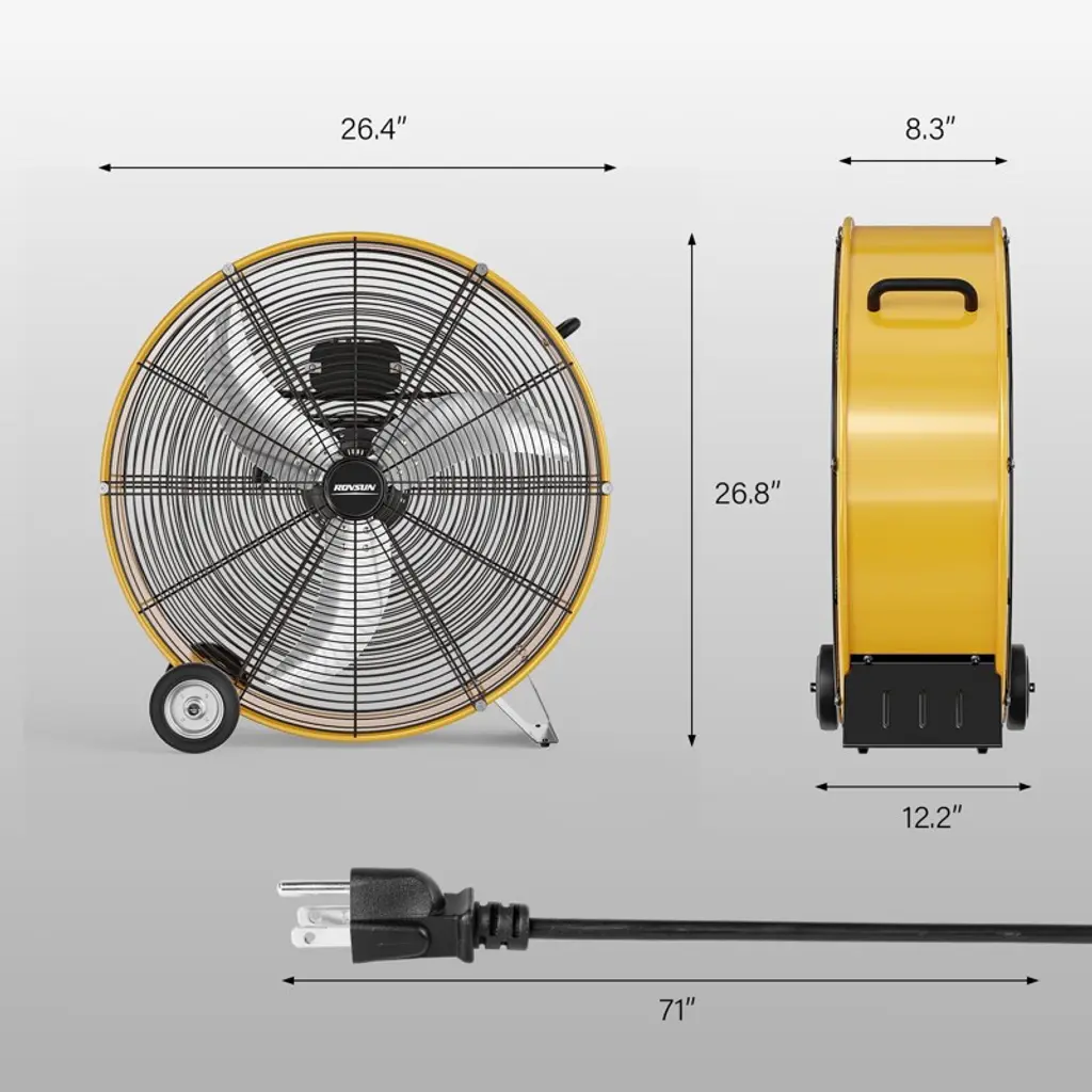 Beat the heat with this high-velocity 24-inch drum fan, designed to deliver 9500 CFM of maximum airflow across three adjustable speeds. Whether you need strong cooling in a workshop, warehouse, gym, or outdoor patio, its industrial-grade motor (built with copper wiring for durability) ensures long-lasting, reliable performance—even under heavy use. The UL-certified, all-metal construction guarantees safety and sturdiness. Portability is effortless thanks to the heavy-duty wheels and ergonomic handle, allowing you to move this fan anywhere with ease. The non-slip rubberized base keeps it stable at any angle, even at full power. Perfect for job sites, garages, retail stores, barns, and backyard gatherings, this fan combines industrial strength with versatile cooling. Stay cool, improve airflow, and boost productivity—order yours today! Features: 3 speed adjustment up to 9500CFM UL listed Stable base Metal fan blades & body All copper wire motor Specifications: Airflow: 9500CFM; 7000CFM; 5000CFM Size: 24'' Maximum power: 130W Dimention: 12.2'' x 26.4'' x 26.8'' (D x W x H) Weight: 22lbs Color: Black/Yellow Packaging includes 1 x 24" industrial drum fan 1 x Instruction manual
