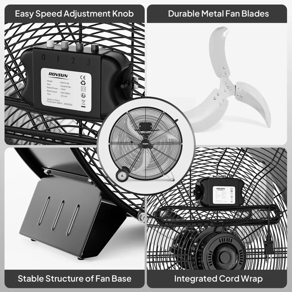 Rovsun 24" Heavy Duty Drum Fan, 9500cfm High Velocity Industria Fan, 3-speed Metal Floor Fan With Handle, Air Circulator For Gym, Barn, Shop, Garage