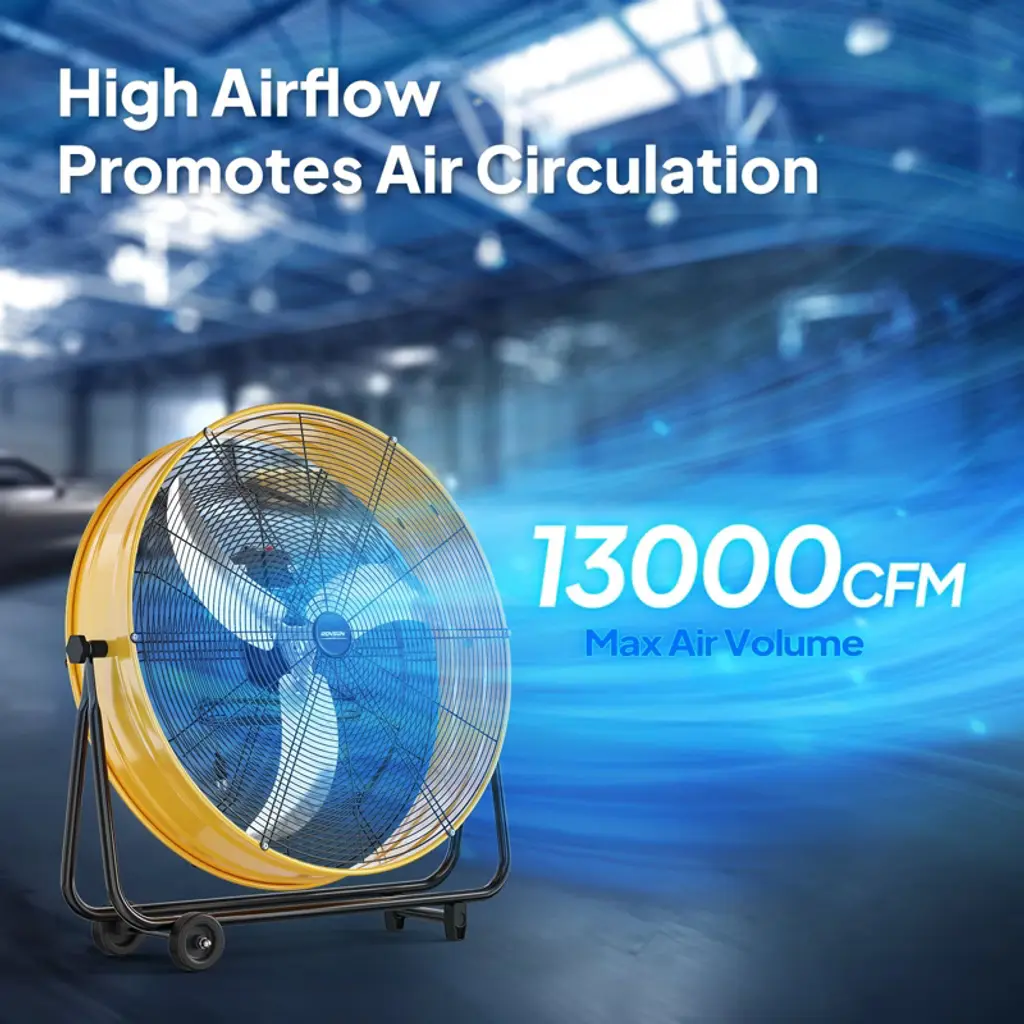 This 30-inch drum fan is ideal for efficient ventilation and comfortable cooling. With three powerful air speeds and a massive airflow of up to 13,000 CFM, it provides full coverage even on low speeds, bringing coolness to your summer workspace. The built-in copper motor and full metal body provide stable and durable operation; the convenient handle and large wheels make it easy to move around; and the 360° adjustable tilt function and non-slip rubber base provide accurate and safe air delivery. From commercial shops and gyms to warehouses and greenhouses to home patios, this 30 inch industrial fan demonstrates strong versatility in multiple scenarios with its excellent performance and adaptability, meeting the ventilation and cooling needs of various spaces.Features:3 speed adjustment up to 13,000CFMUL listed Stable base360° adjustable tilt Metal fan blades & bodyAll copper wire motorSpecifications:Airflow: 13,000CFM; 12,600CFM; 11,800CFMSize: 30''Tilt: 365°Maximum power: 230WDimention: 8.7'' x 36.2'' x 37.4'' (D x W x H)Weight: 28.7lbsColor: Black/YellowPackaging includes1 x 30'' industrial drum fan1 x Instruction manual