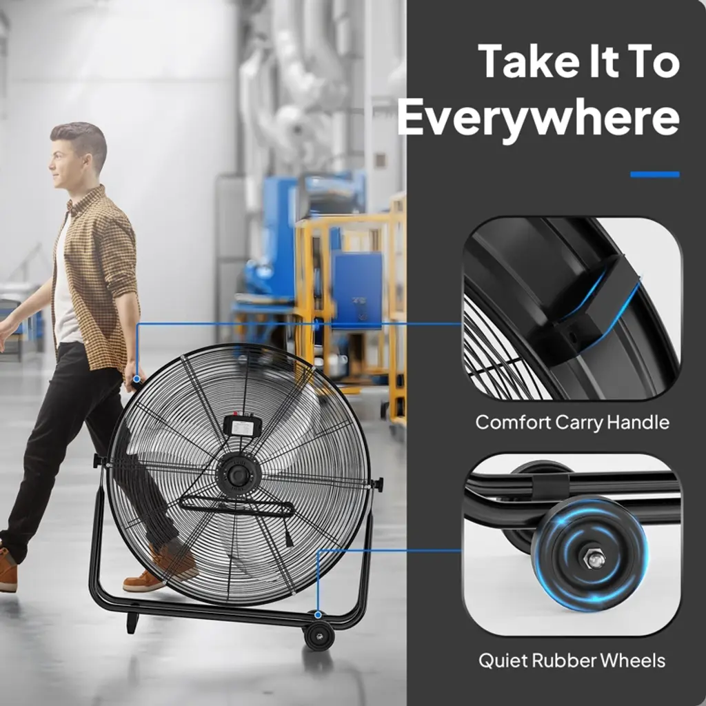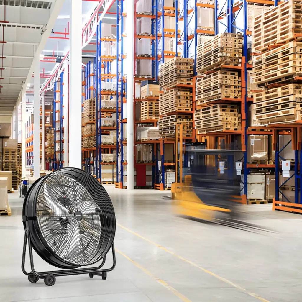 This 30-inch drum fan is ideal for efficient ventilation and comfortable cooling. With three powerful air speeds and a massive airflow of up to 13,000 CFM, it provides full coverage even on low speeds, bringing coolness to your summer workspace. The built-in copper motor and full metal body provide stable and durable operation; the convenient handle and large wheels make it easy to move around; and the 360° adjustable tilt function and non-slip rubber base provide accurate and safe air delivery. From commercial shops and gyms to warehouses and greenhouses to home patios, this 30 inch industrial fan demonstrates strong versatility in multiple scenarios with its excellent performance and adaptability, meeting the ventilation and cooling needs of various spaces.Features:3 speed adjustment up to 13,000CFMUL listed Stable base360° adjustable tilt Metal fan blades & bodyAll copper wire motorSpecifications:Airflow: 13,000CFM; 12,600CFM; 11,800CFMSize: 30''Tilt: 365°Maximum power: 230WDimention: 8.7'' x 36.2'' x 37.4'' (D x W x H)Weight: 28.7lbsColor: Black/YellowPackaging includes1 x 30'' industrial drum fan1 x Instruction manual