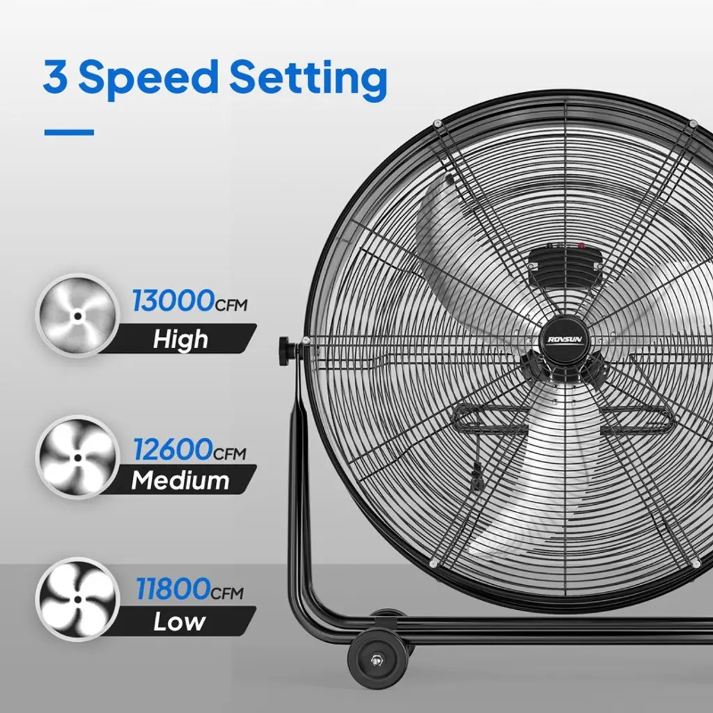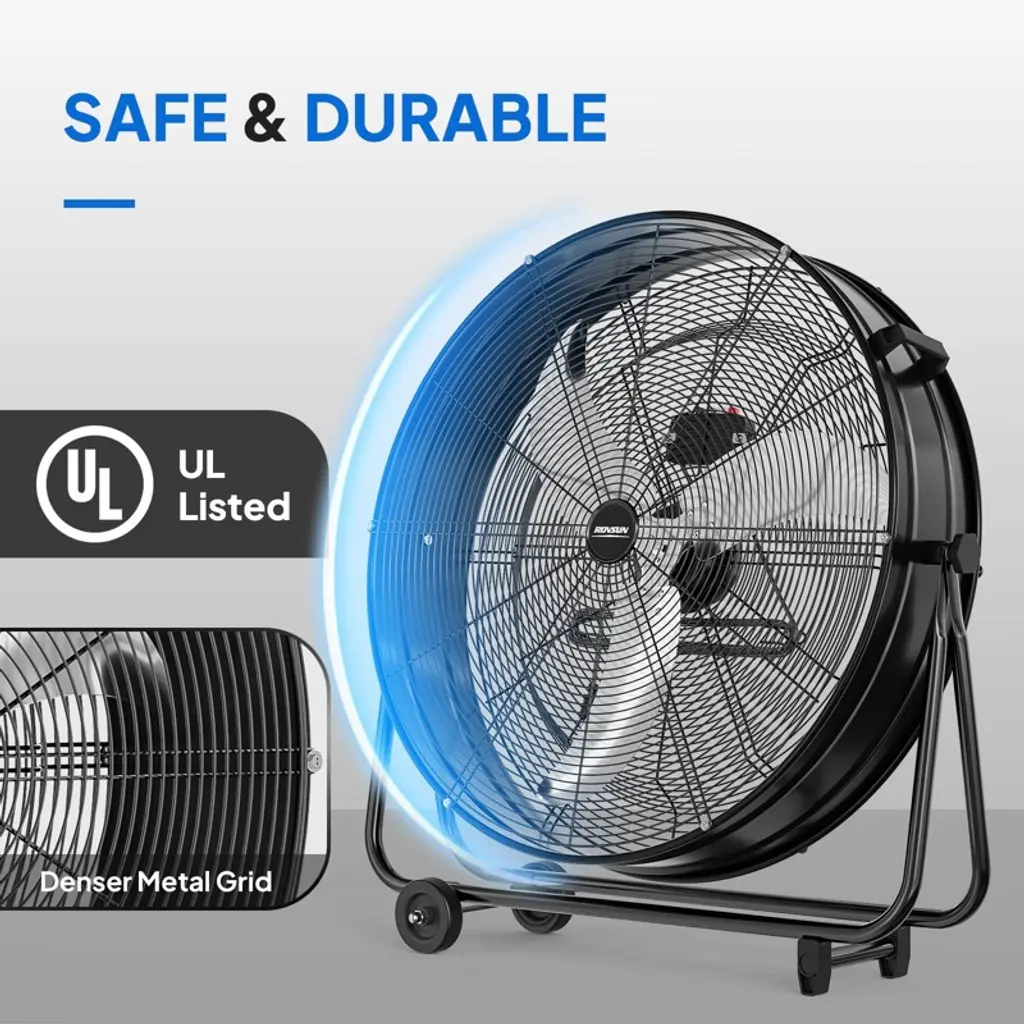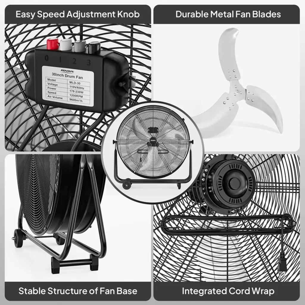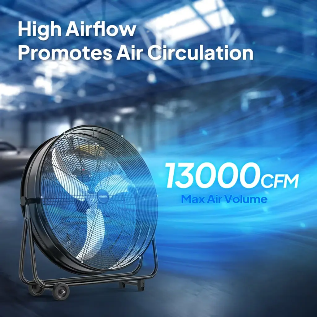 Rovsun 30'' Heavy Duty Drum Fan, 13000cfm High Velocity Industrial Metal Floor Fan With Handle, 3-speed & 360° Tilt For Shop Garage Gym Warehouse