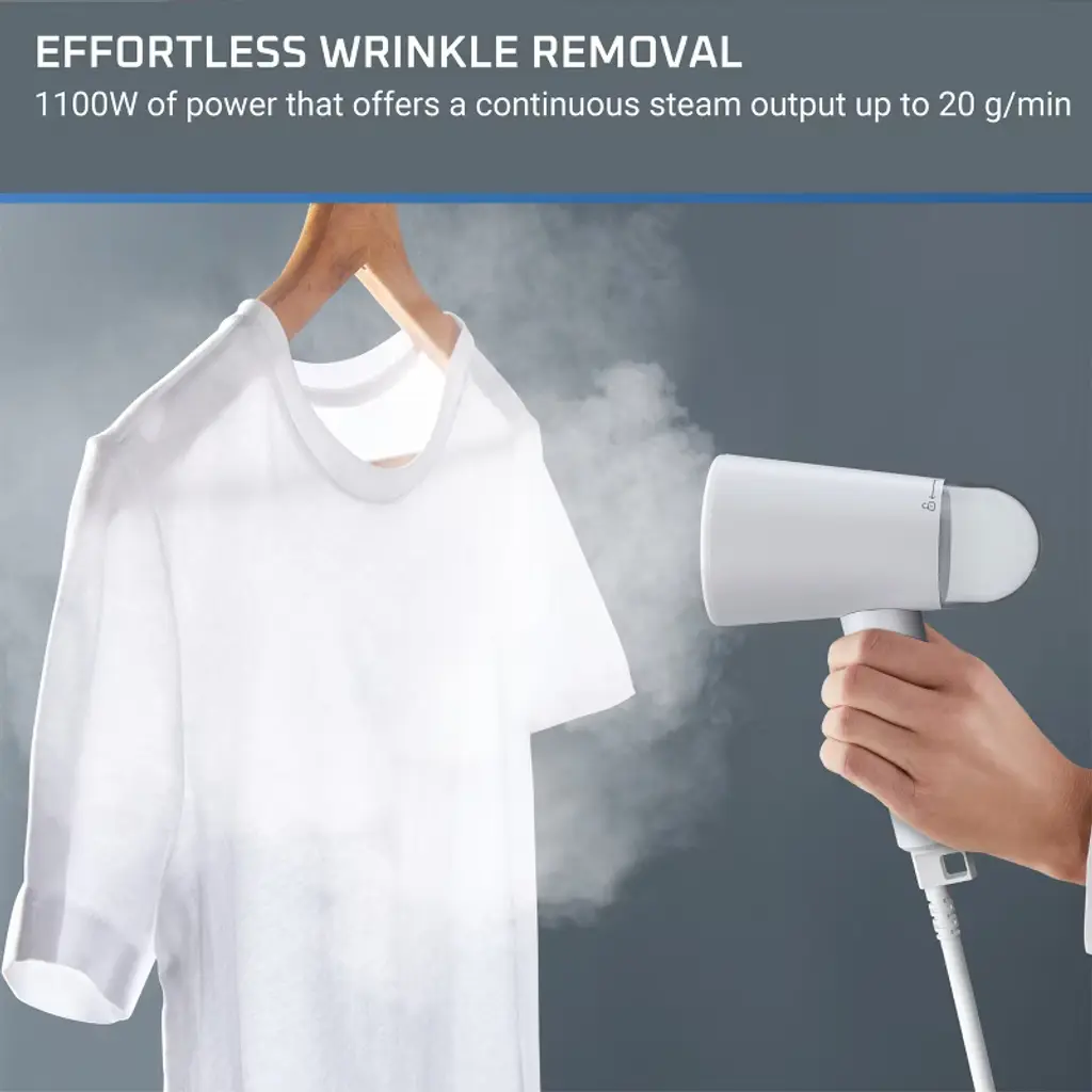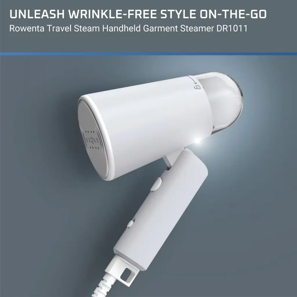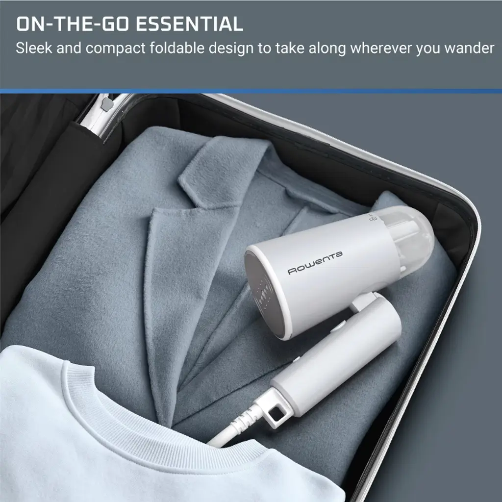 With an ultra-compact, sleek frame that's foldable, Travel Steam by Rowenta is the perfect travel-ready handheld steamer for clothes. This portable garment care solution offers the full package: a lightning-quick 25-second heat-up time, 1100 Watts of power, reliable steam output up to 20 g/minute, purifying steam power that refreshes all fabric types, and an easy-to-refill removable water tank.