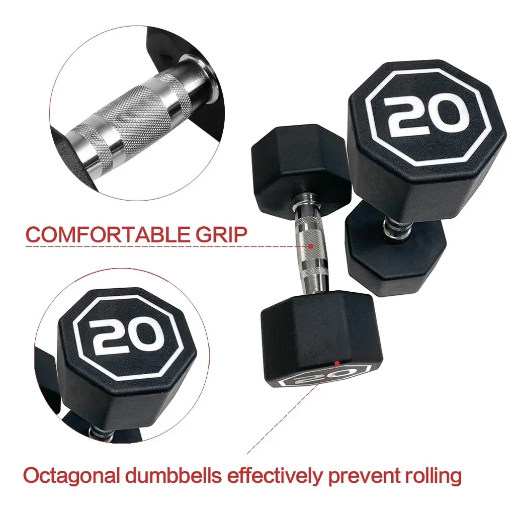 Specification:Description:Enhance your workout routine with this set of 2 premium octagonal dumbbells, each weighing 15 lbs. featuring a durable, non-slip, odorless RPE rubber-plastic elastomer coating, these dumbbells minimize floor damage from drops. The chrome-plated, contour knurled handles offer a glossy, silver-white finish that is both visually appealing and highly resistant to wear, ensuring a secure, slip-resistant grip and preventing calluses. The large, easy-to-read numbers on each dumbbell make it simple to select the right weight at a glance, while the octagonal shape prevents rolling, making storage and organization hassle-free. Perfect for push-ups, bench presses, curls, squats, and more, these versatile dumbbells are ideal for both home and commercial use, providing a stable and comfortable grip during your workouts.Key Features: