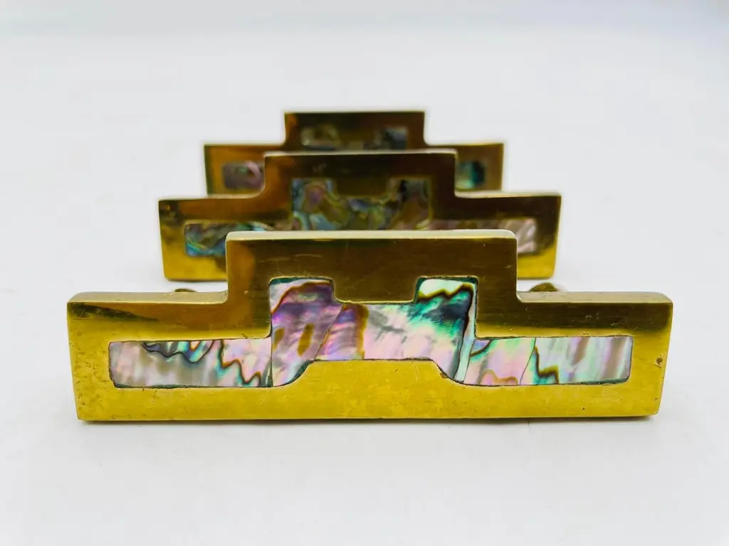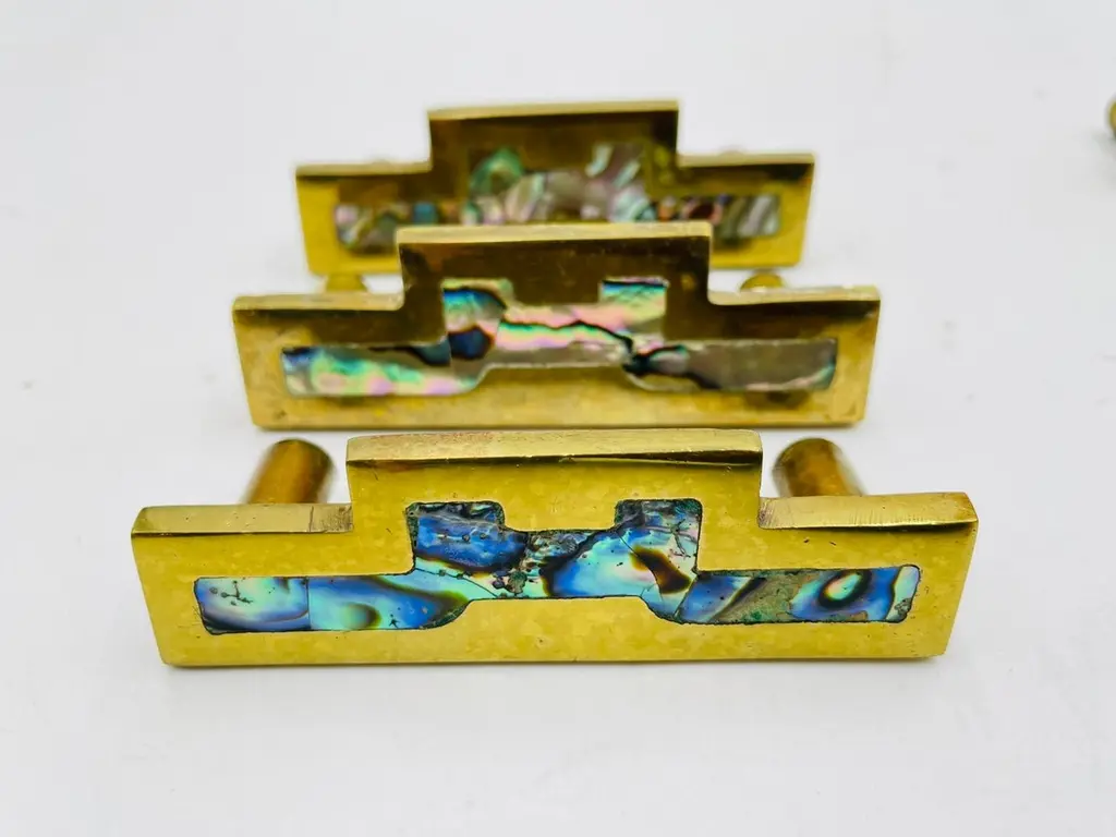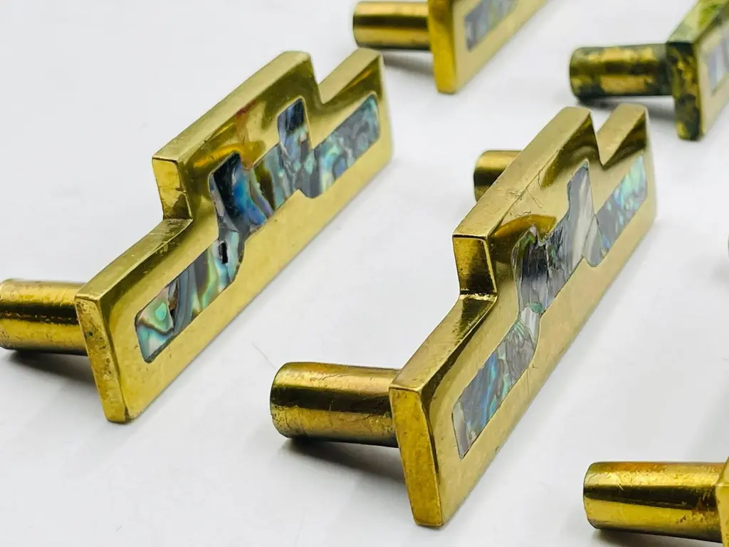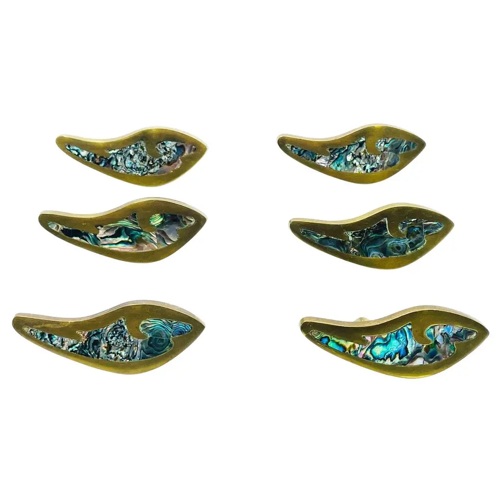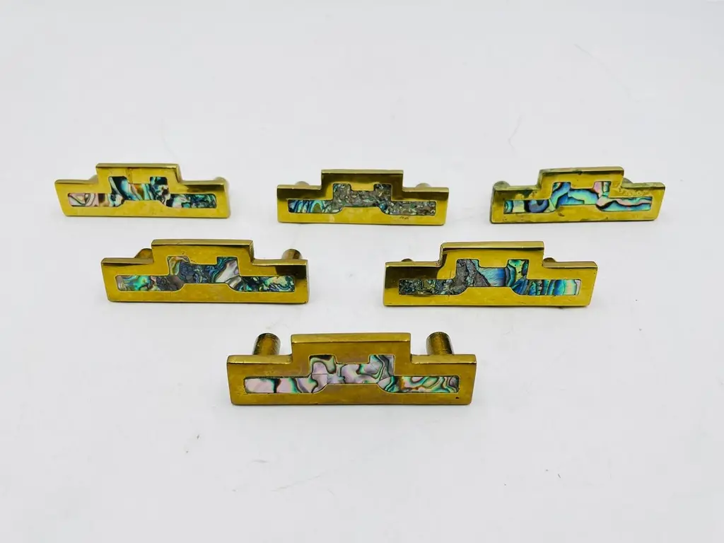 Set Of 6 Cabinet Pulls In Brass & Abalone Shell Inlay By Peñoles, Mexico 1950s