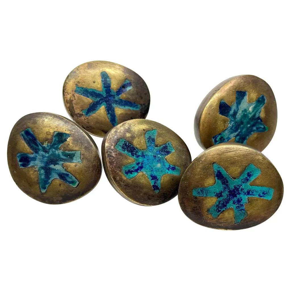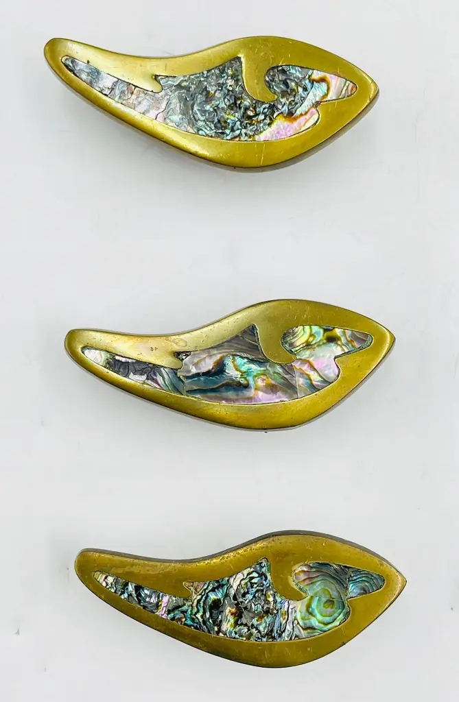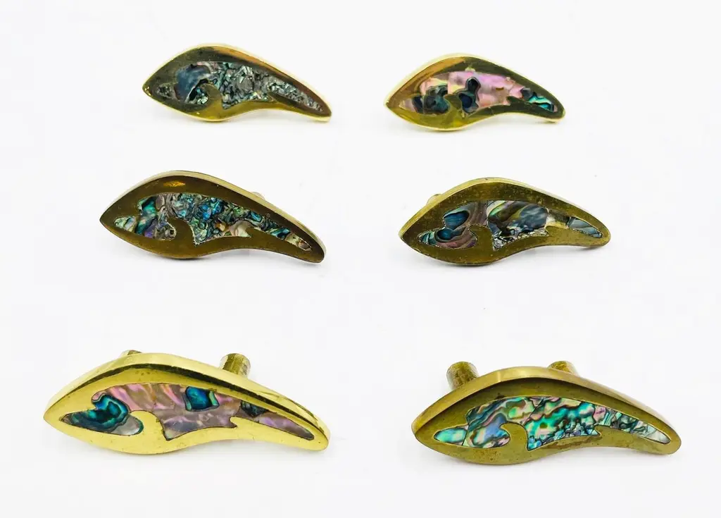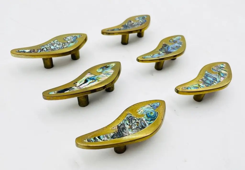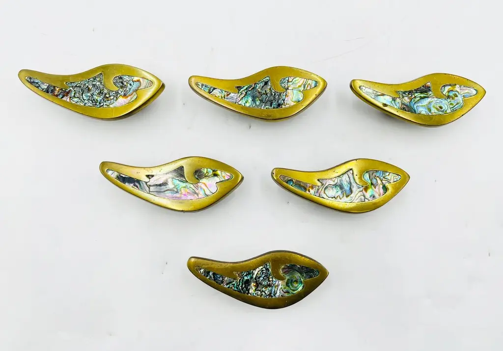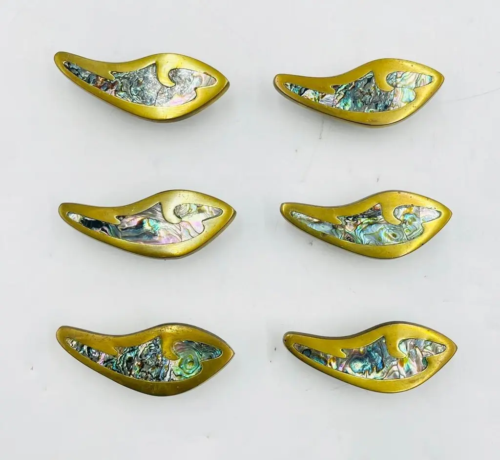 Set Of 6 Cabinet Pulls In Brass & Abalone Shell Inlay By Peñoles, Mexico 1950s
