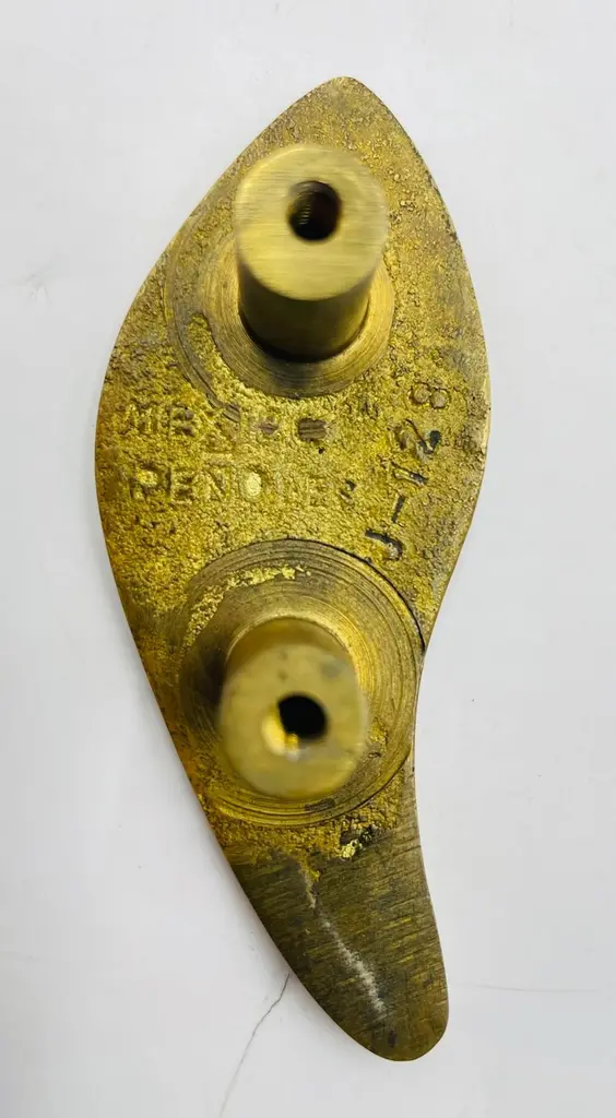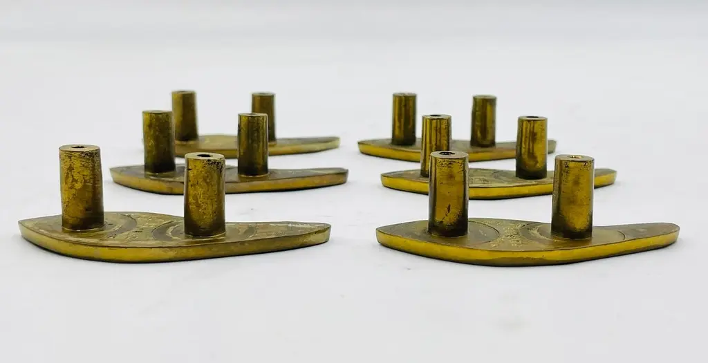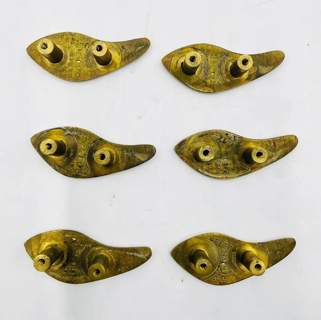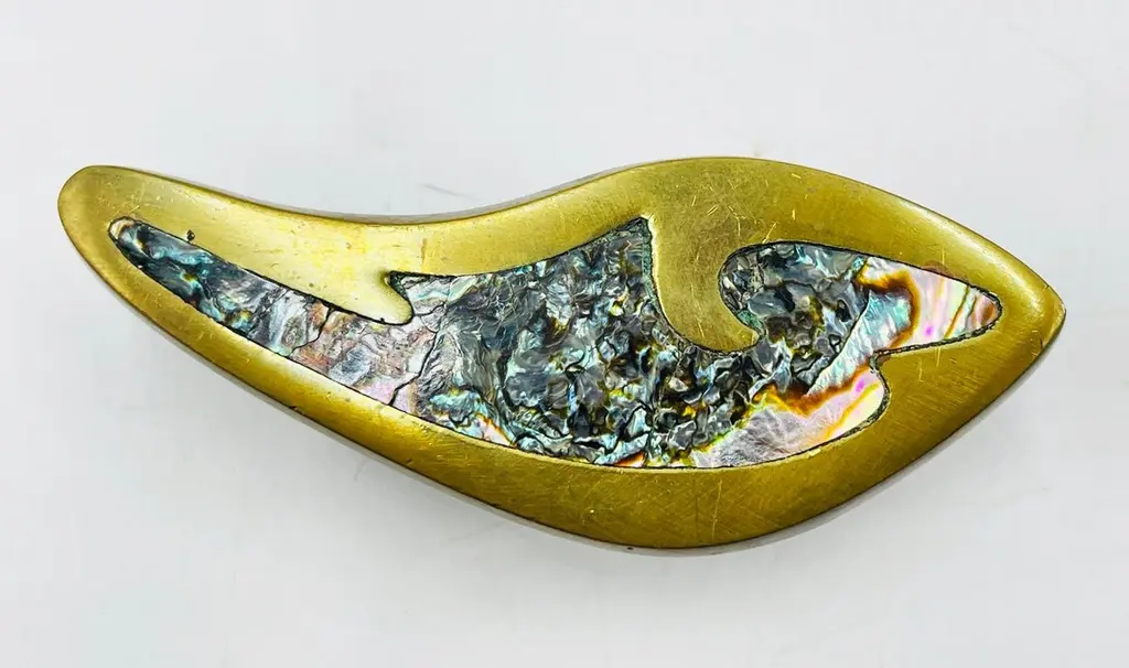 Enhance the elegance and uniqueness of your cabinets with this exquisite Set of 6 Cabinet Pulls in Solid Brass & Abalone Shell Inlay by Peñoles.The pieces were designed and manufactured in the 1950's in Mexico Distrito Federal by Peñoles. Each pull features a stunning combination of solid brass and vibrant abalone shell inlay, creating a luxurious and eye-catching design.The fusion of traditional craftsmanship and modern aesthetics make these pulls a truly one-of-a-kind addition to your home decor. Each piece is marked; Mexico D.F. Peñoles, J-128.We have 3 sets of 6 in total.Measurements: 3 inches wide x 1 inch high x 1 inch deep/projection.