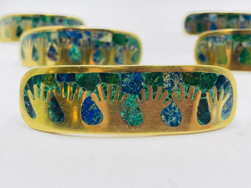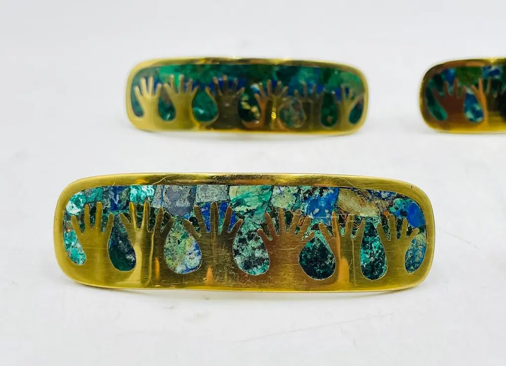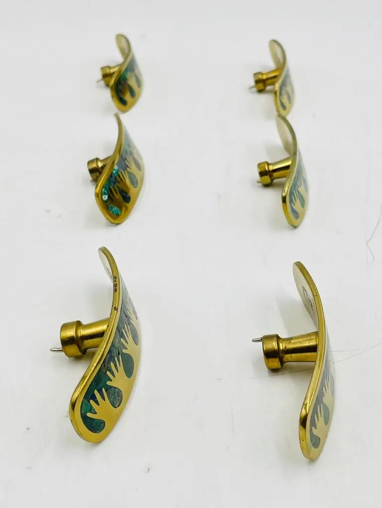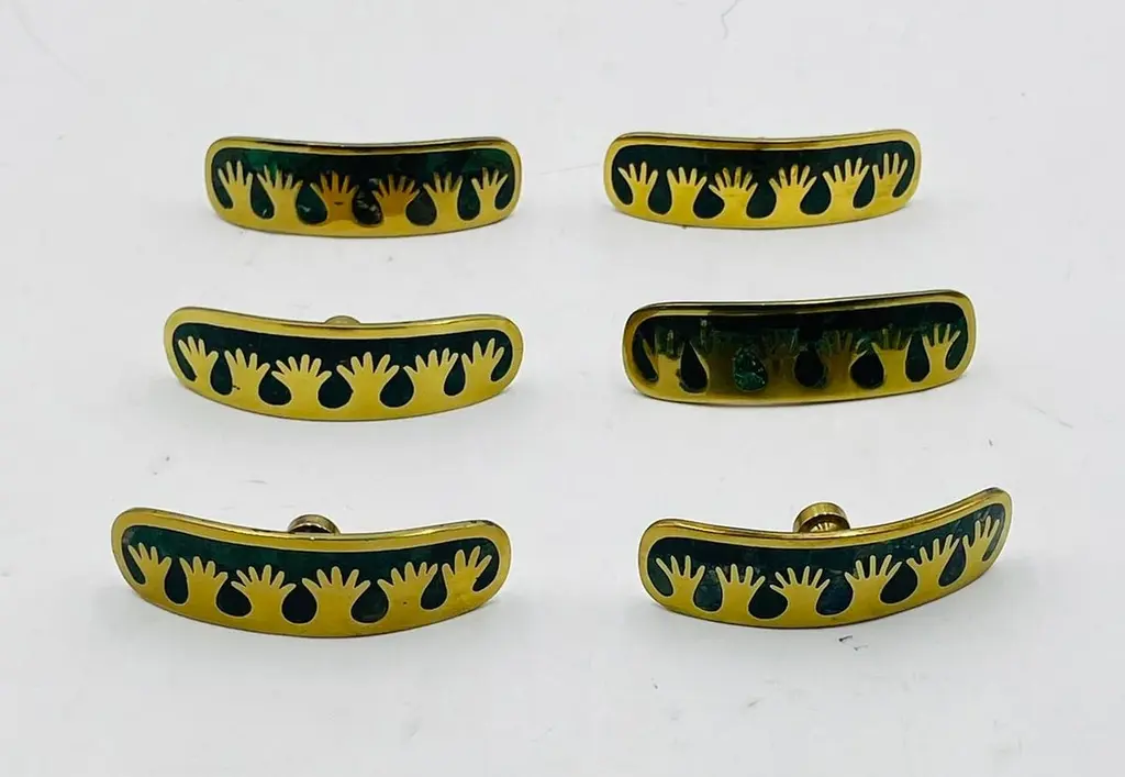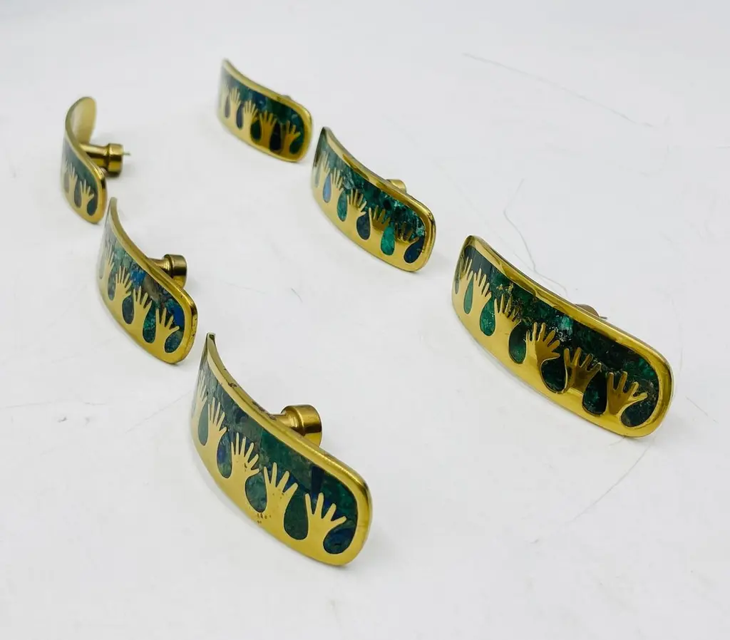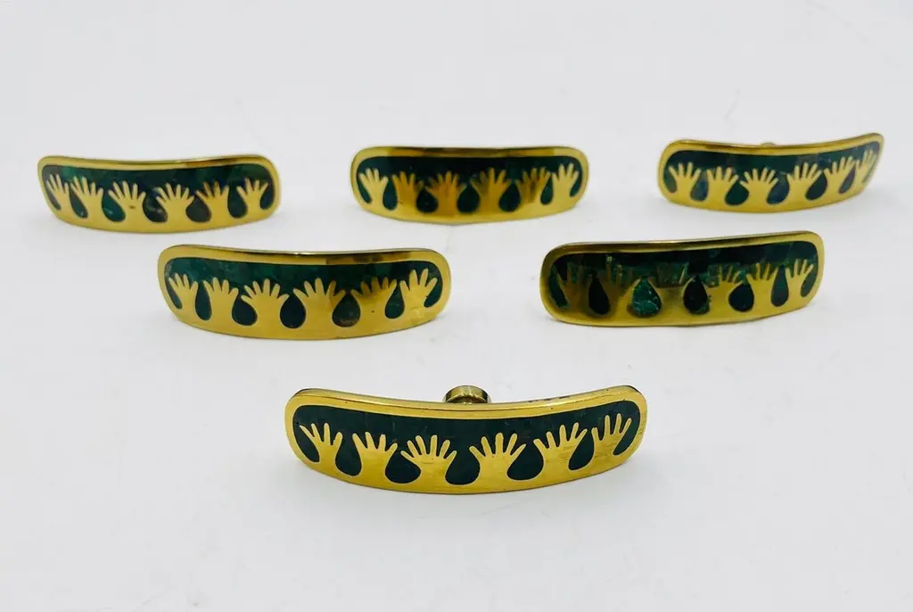 Set Of Six Cabinet Pulls In Brass & Stone Inlay By Los Castillo, Mexico 1950's