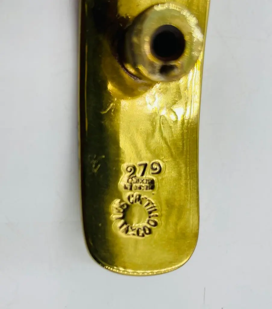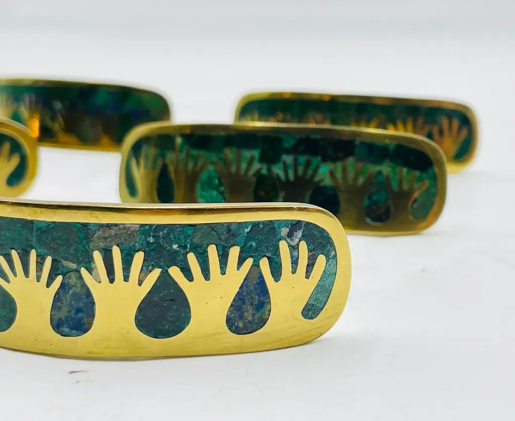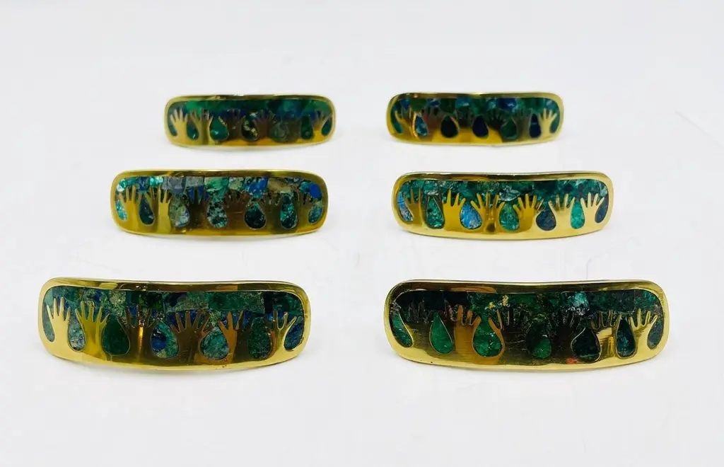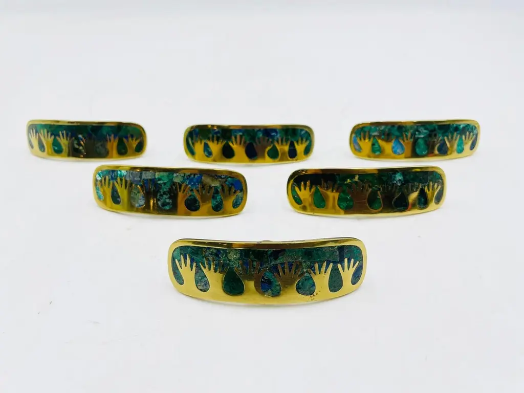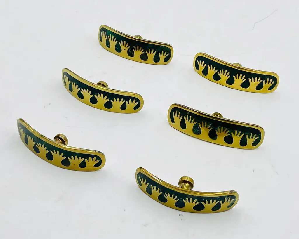 Add a touch of Mexican flair to your cabinets with this stunning Set of Six Cabinet Pulls in Brass & Stone Inlay designed and manufactured in Taxco Mexico in the 1950's by Los Castillo. Each pull features a unique combination of brass and stone inlay, creating a one-of-a-kind look. Handcrafted with great attention to detail and design, these pulls add a pop of color and texture to any furniture piece. The intricate detailing and craftsmanship make these pulls a true statement piece for your home. Each piece retains the Los Castillo hallmark which reads; Los Castillo, Hecho en Mexico, Taxco, # 279.Measurements: 3.50 inches wide x 1 inch deep x 1 inch high.