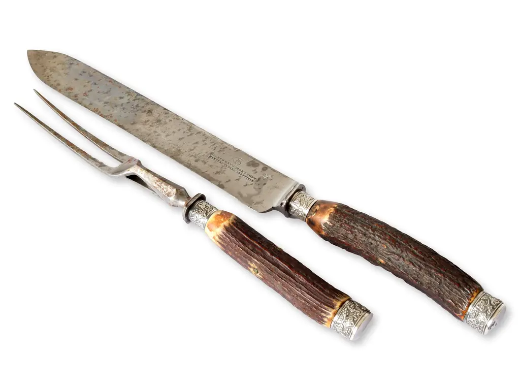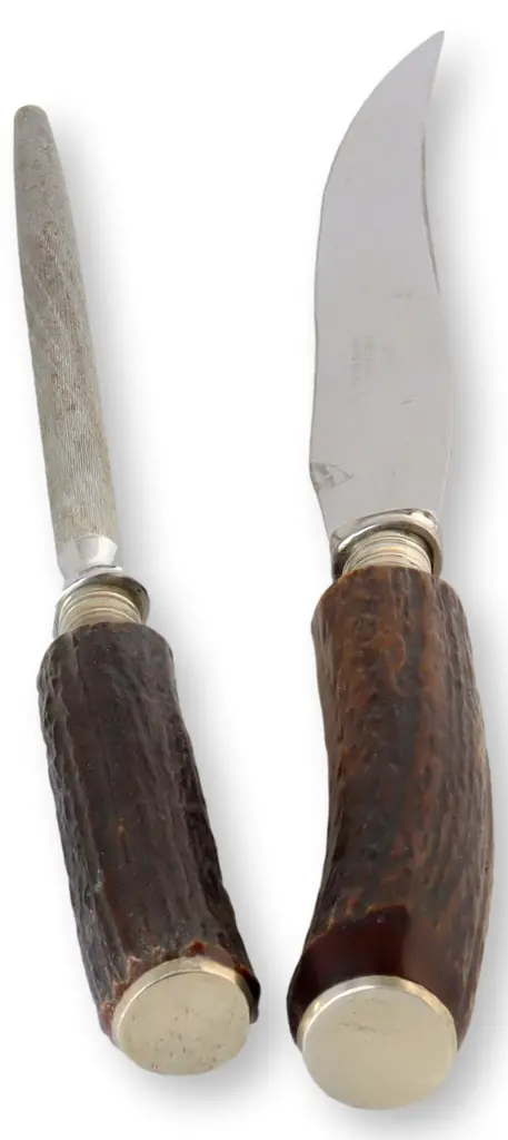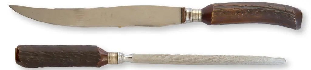 Horn handled carving set with Sheffield blade. Includes sharpening steel. Dimensions: Knife, 13.25"L x 1"W; sharpening steel, 11.75"L x 1"W. Maker's mark on blade.