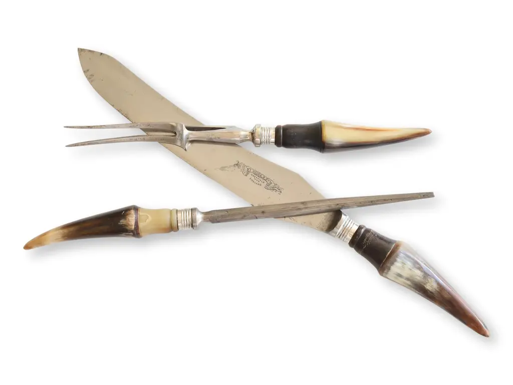 This Antique English Sheffield Polish Horn Handled Carving Set is a quintessential example of fine craftsmanship. The polished horn handles, paired with Sheffield steel, denote quality and tradition, making this set a coveted item for culinary connoisseurs or as a distinguished addition to a classic dining ensemble. Signed on blade. dimensions- knife: 14.25"L x 1.5"W x 1"H sharpening tool: 11.75"L x 1"W x 1"H fork: 10.5"L x 1"W x 1"H